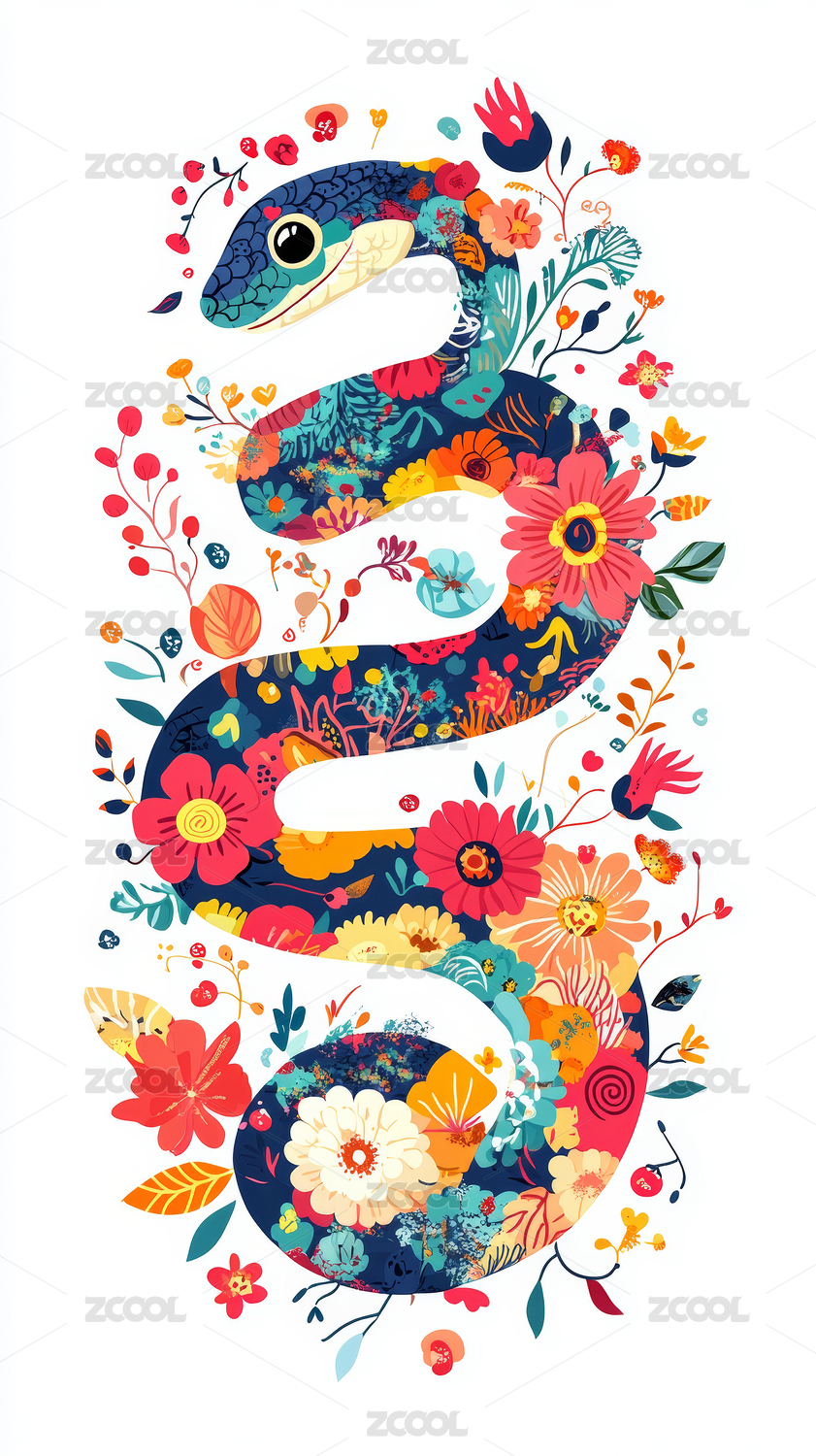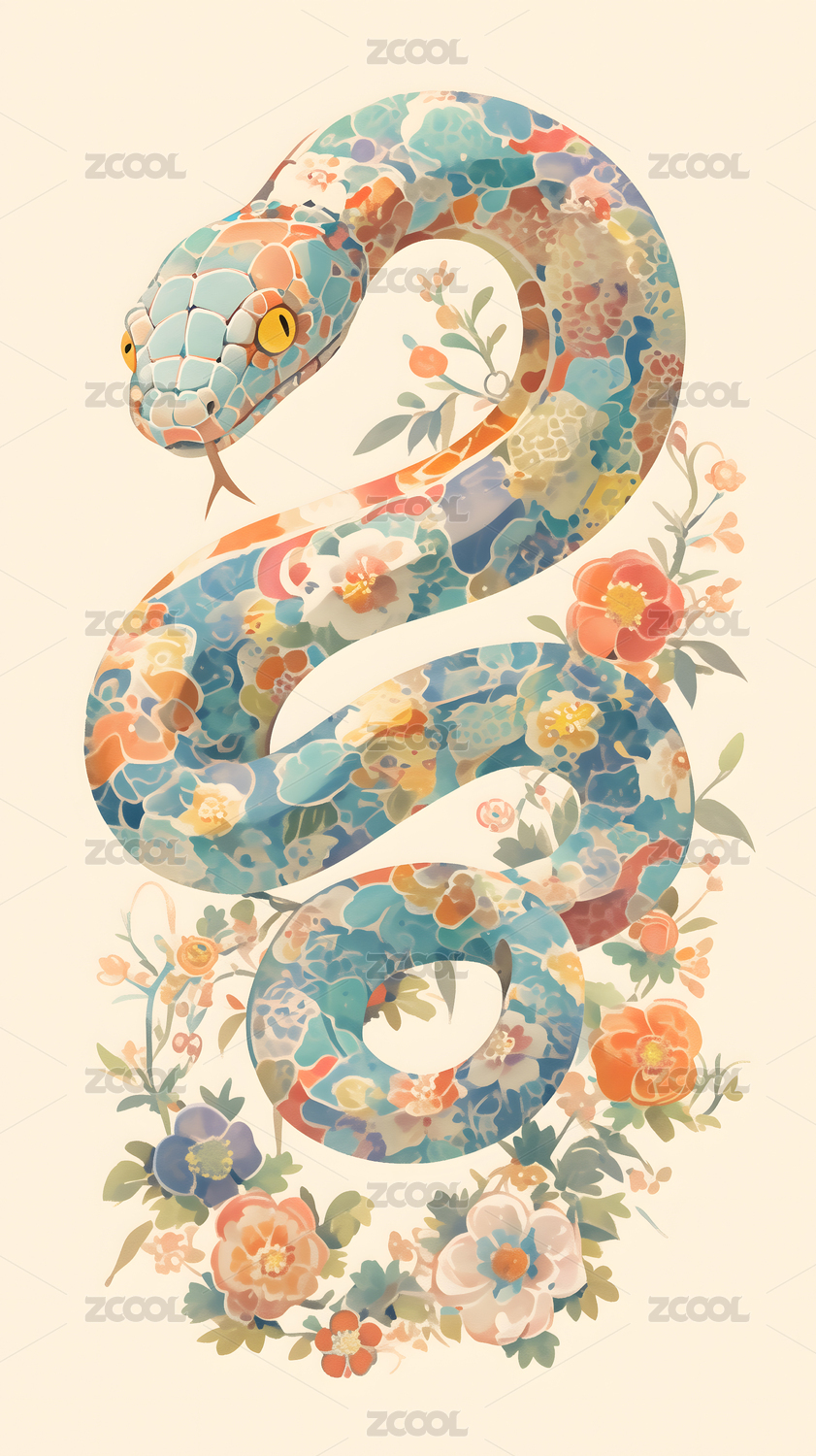 喜庆的复古风格五彩斑斓的蛇和花朵