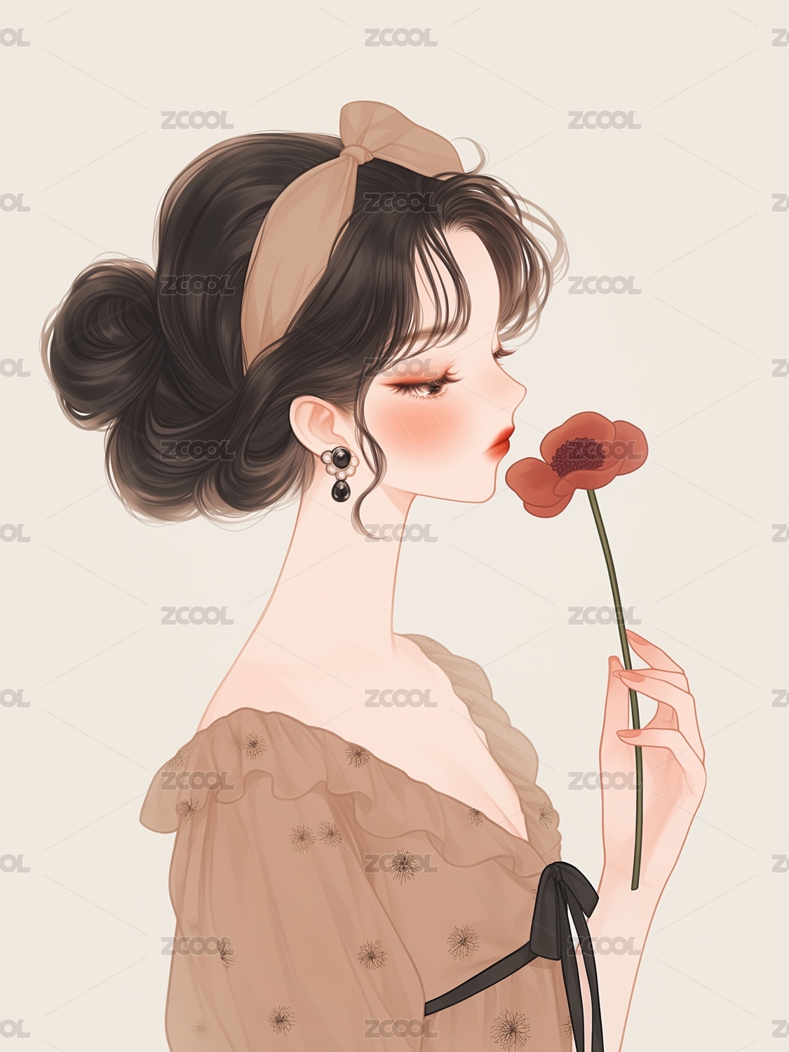 郁金香花朵蝴蝶结麻花辫温柔少女插画