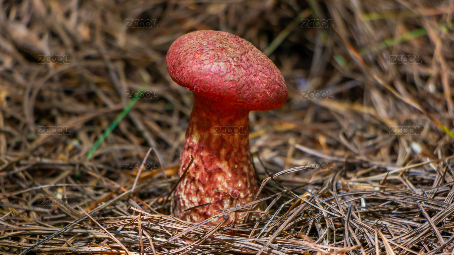 罕见的野生松菌蘑菇生长在户外潮湿的枯叶丛中