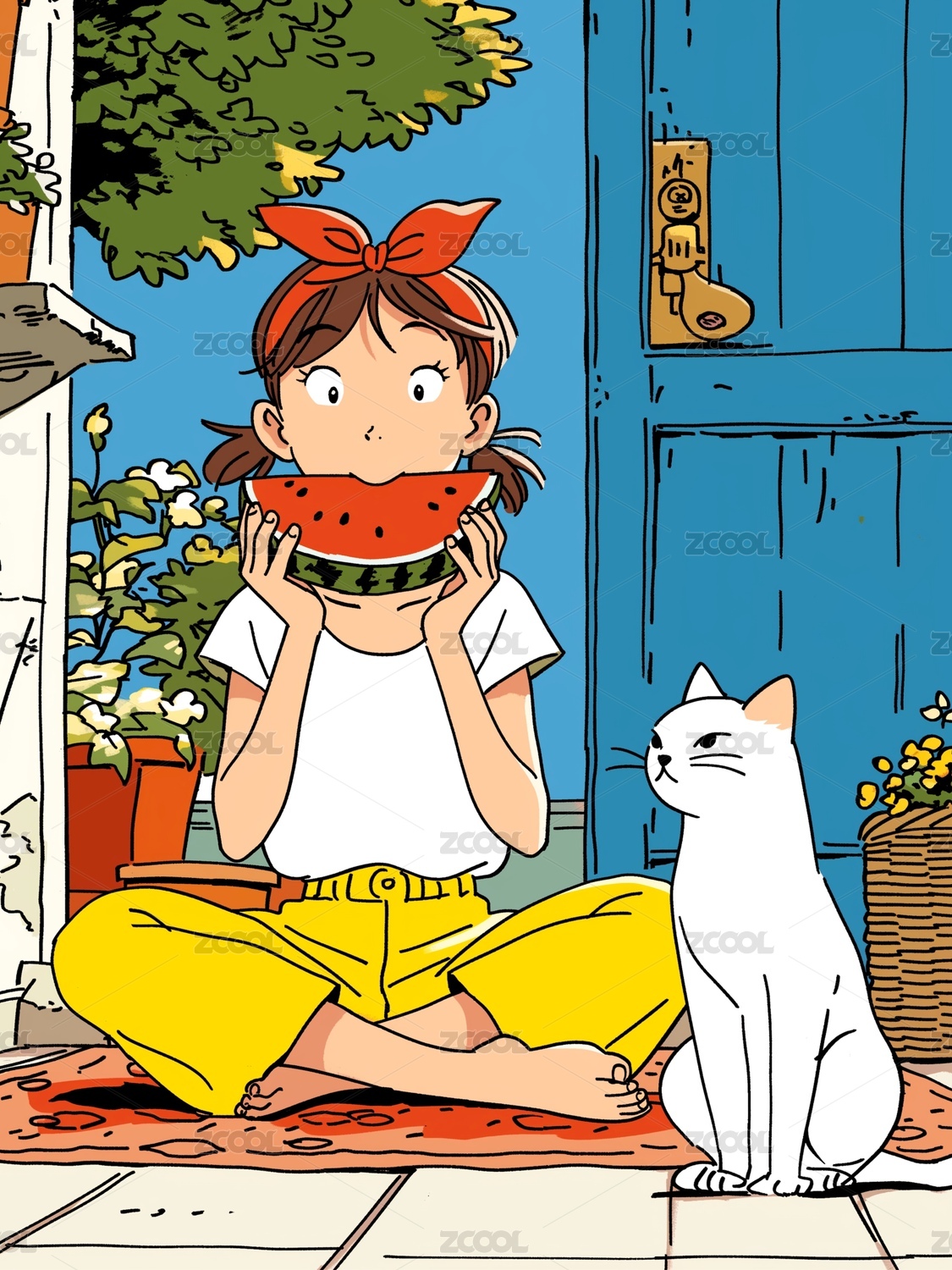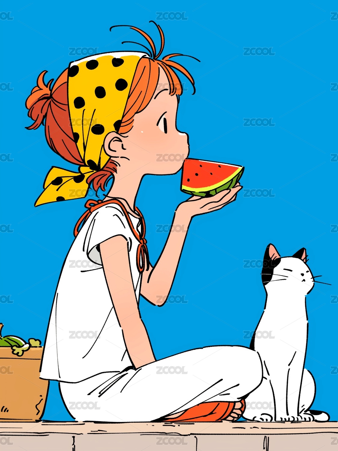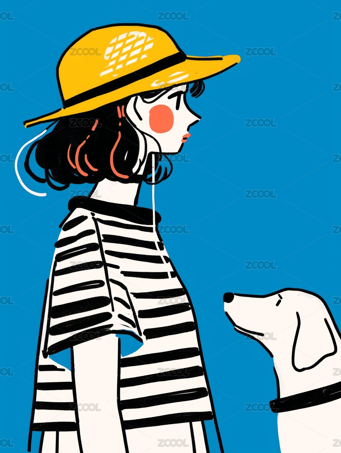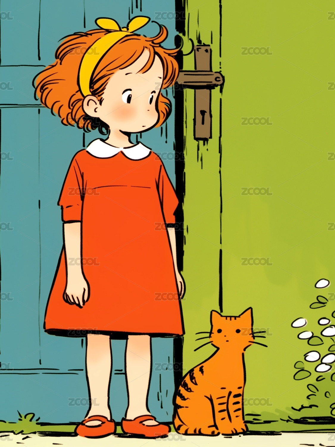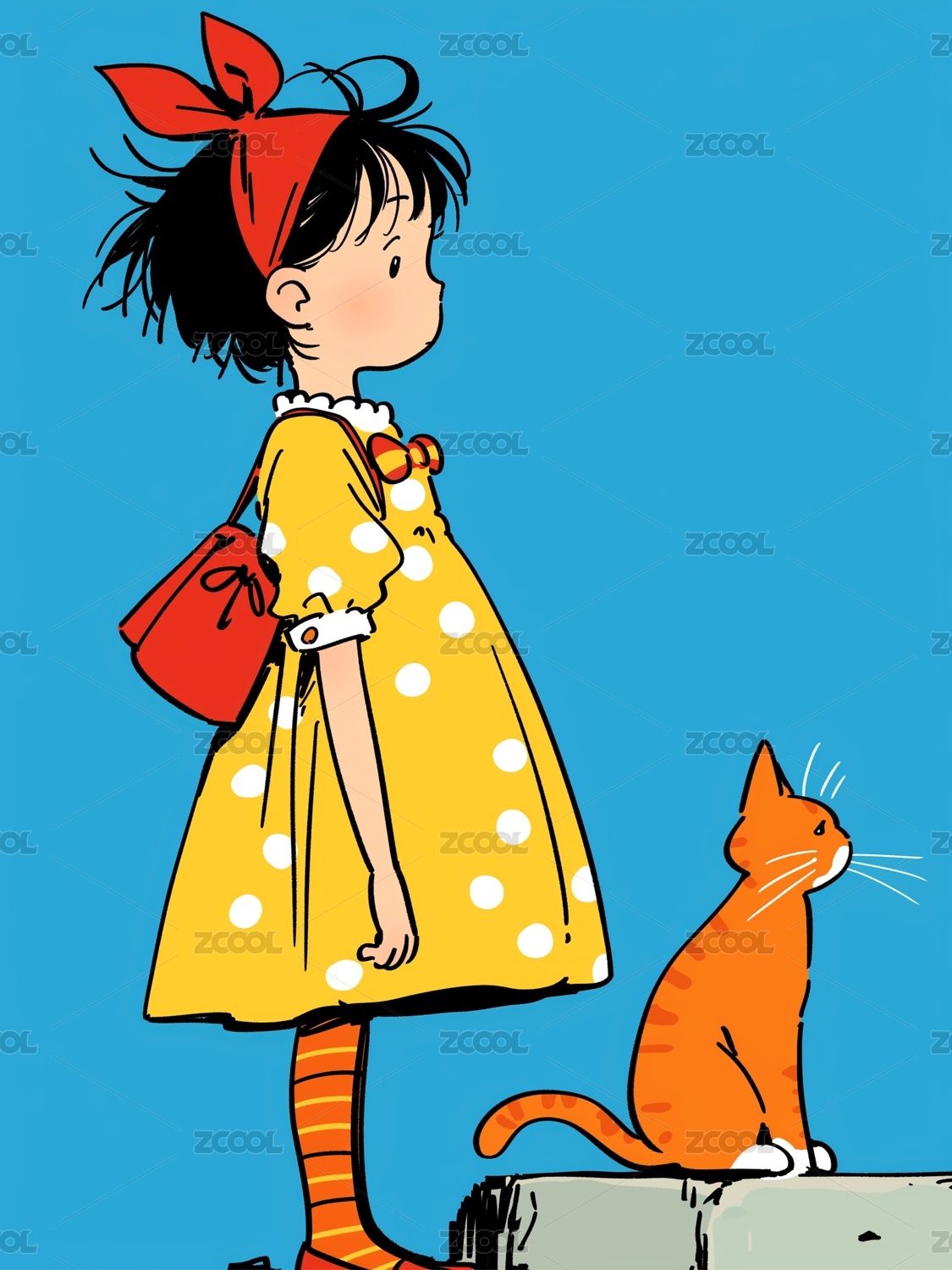 少女,猫咪,扁平风,简笔风,艳丽色彩,治愈系,插画