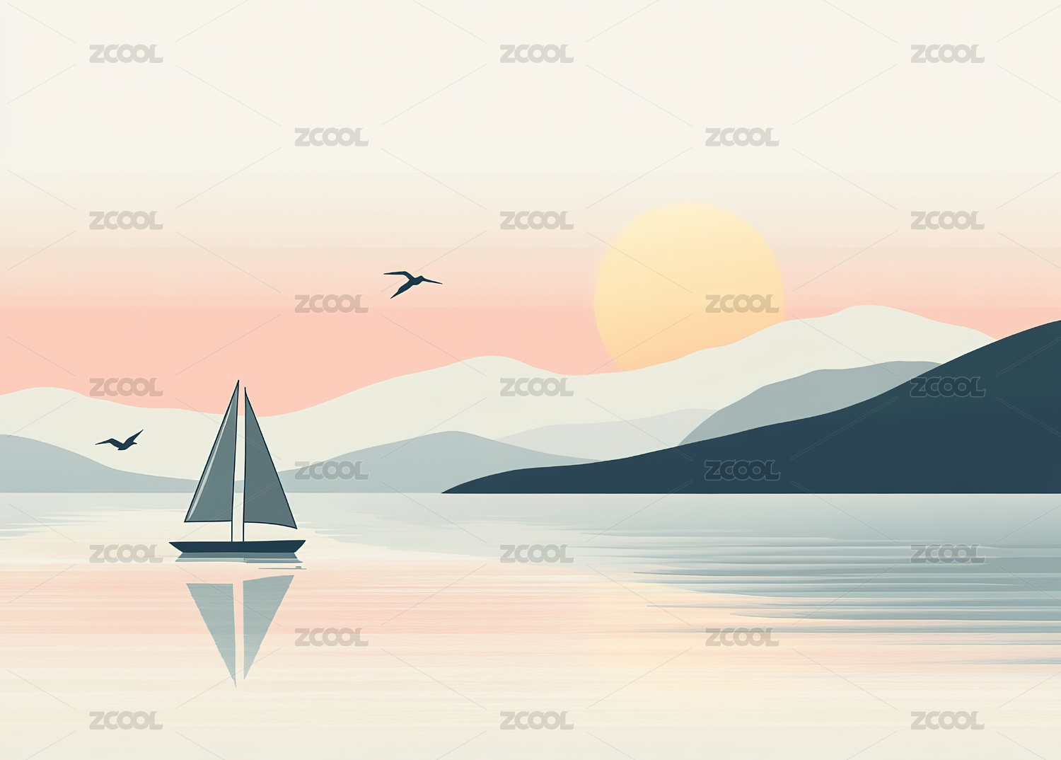 海上黄昏帆船插画