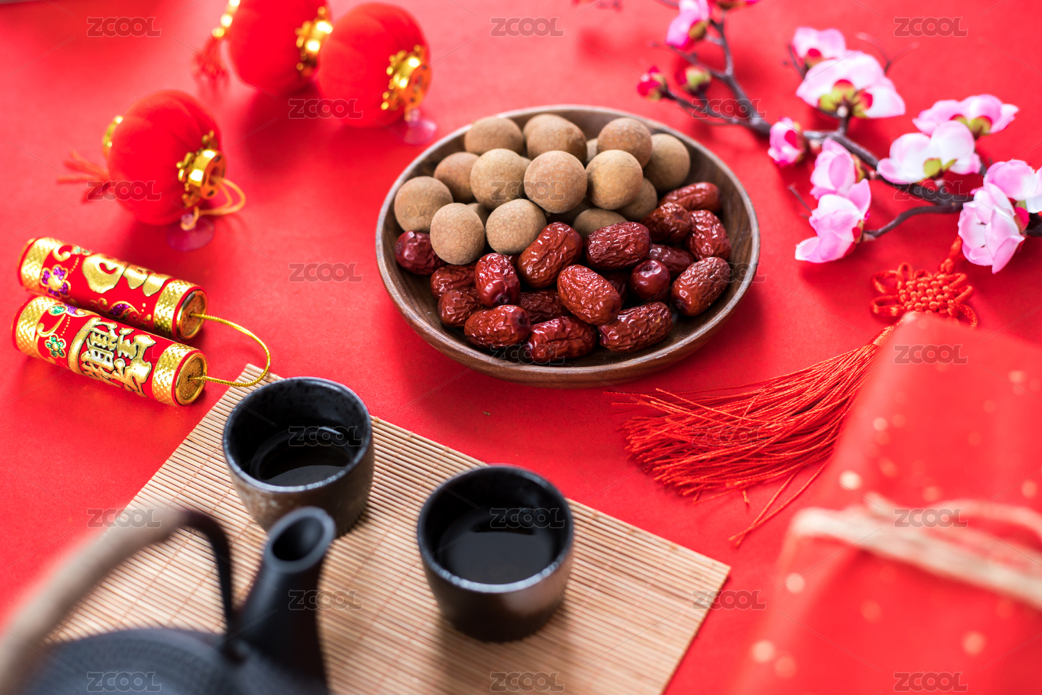 茶礼,干货,年货,红色,喜庆,灯笼,桃枝,铁壶,茶具,零食