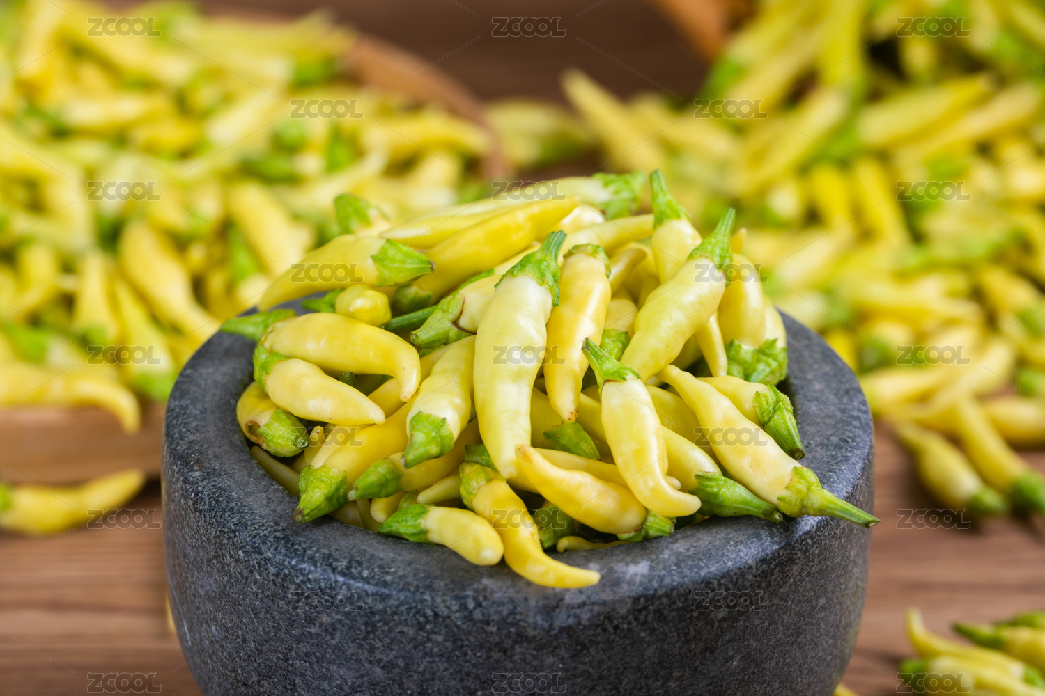 木碗装着朝天椒放在一堆黄绿色小米椒上