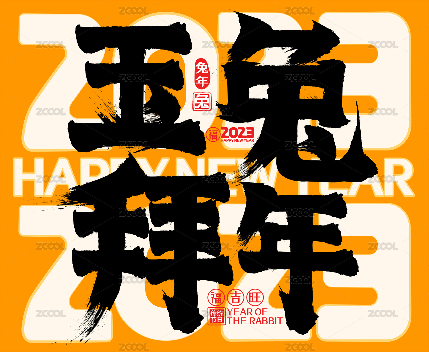 玉兔拜年2023兔年春节新年快乐毛笔字