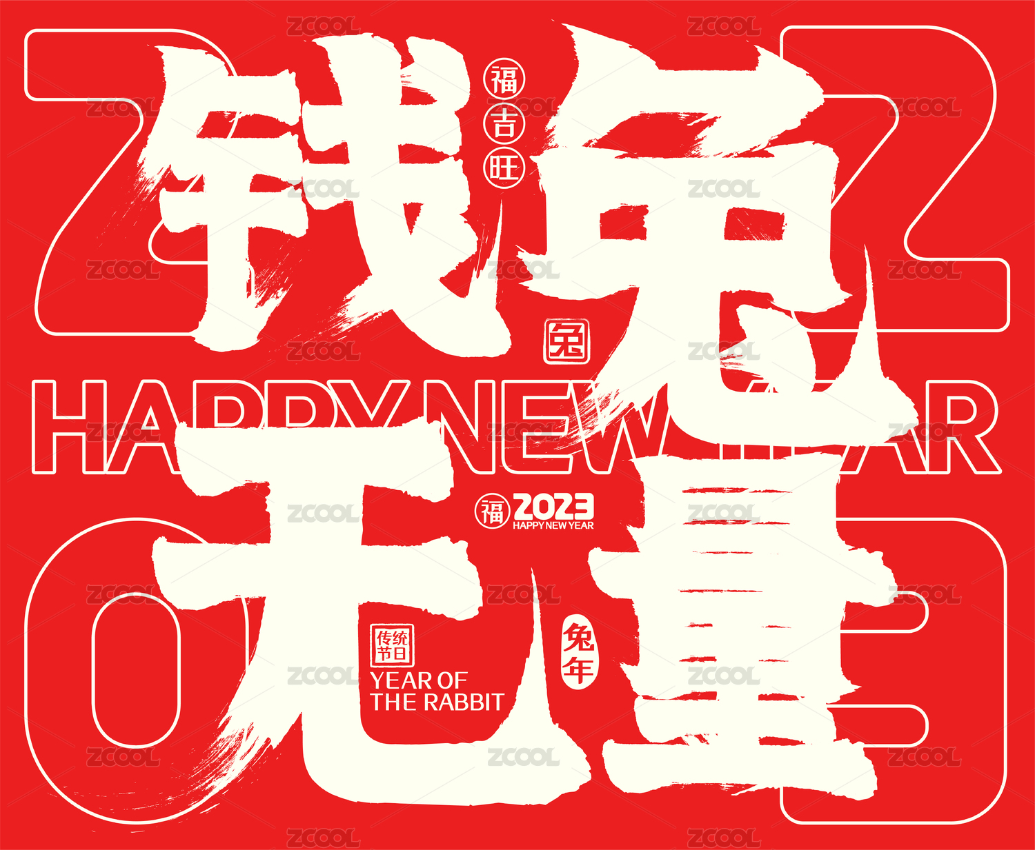 2023钱兔无量喜庆中国红兔年春节毛笔字