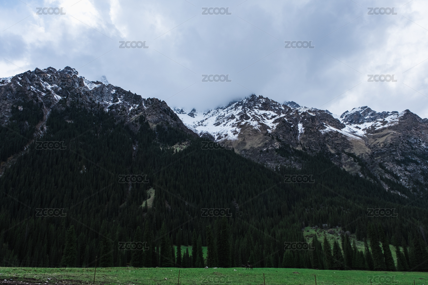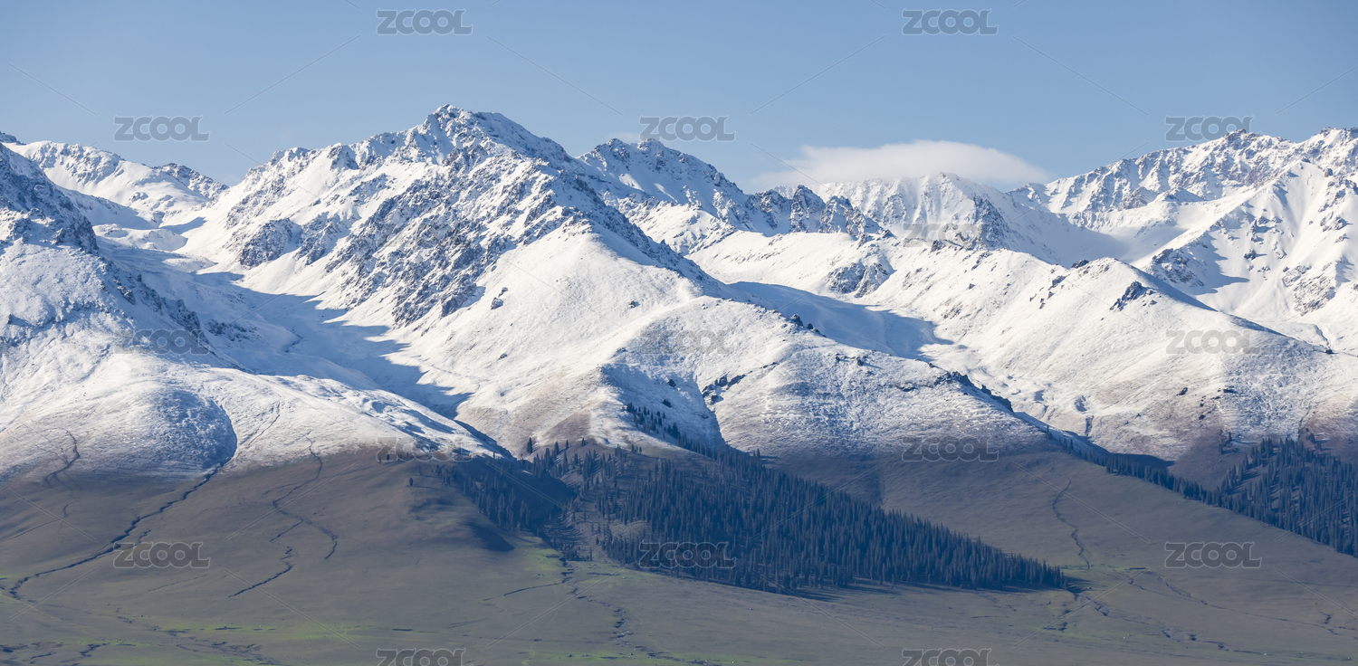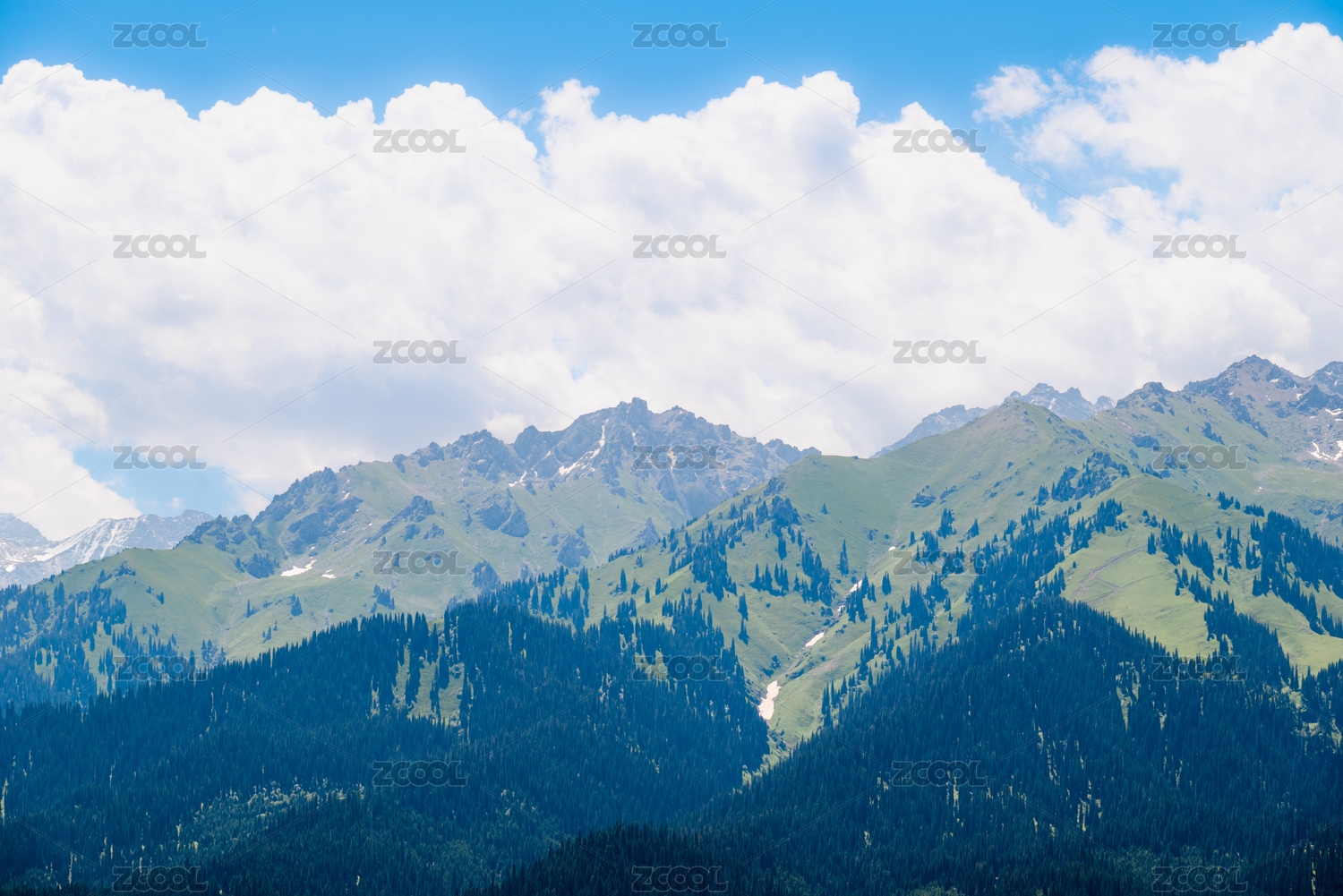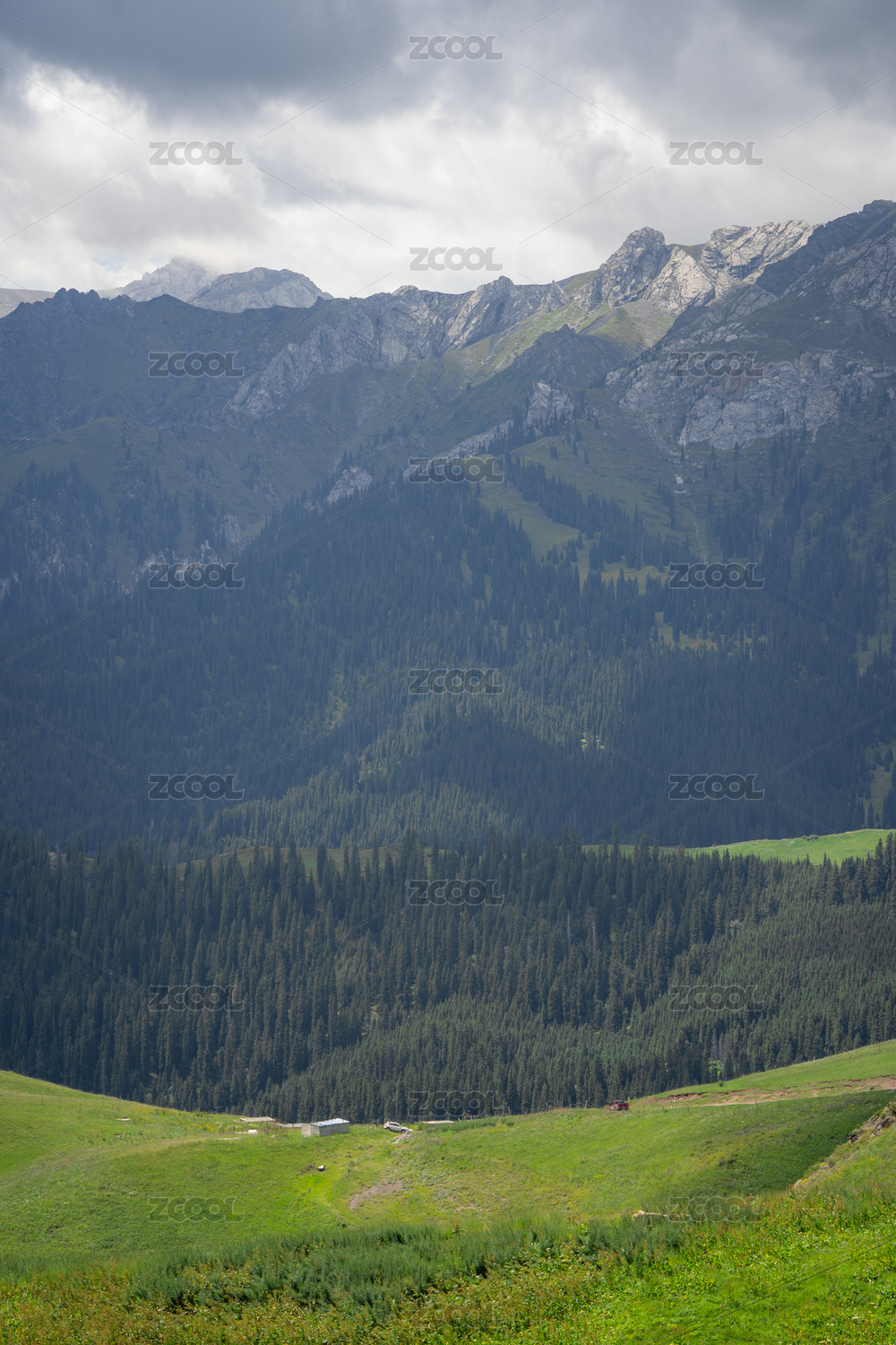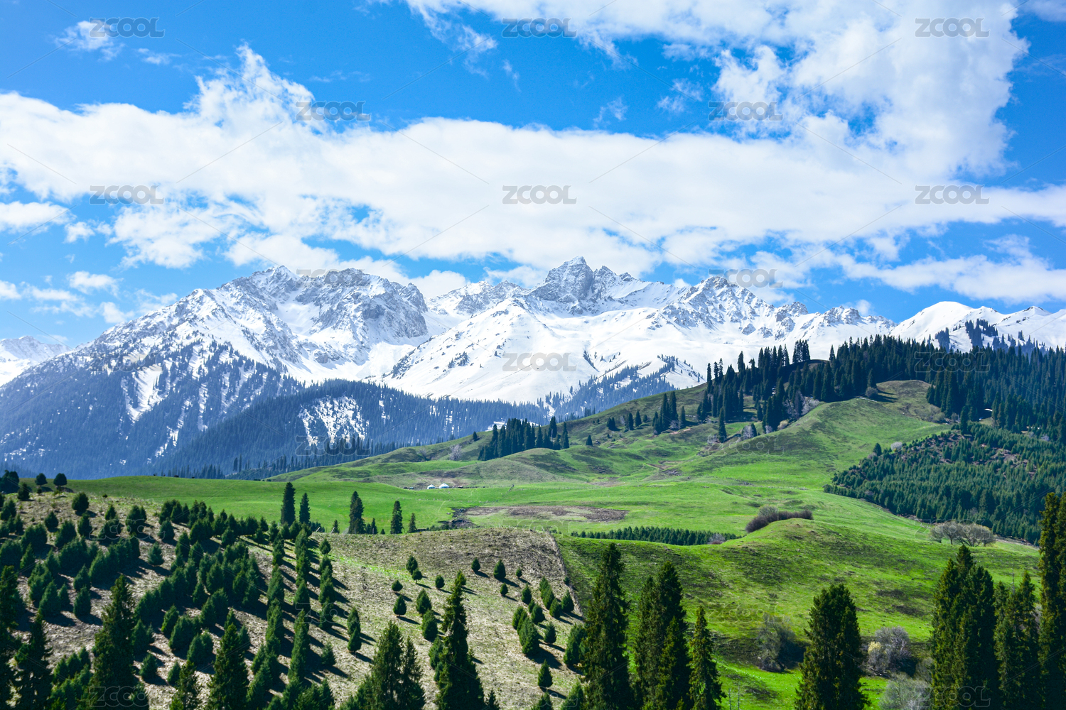 中国伊犁那拉提空中草原的雪山草地森林与牧