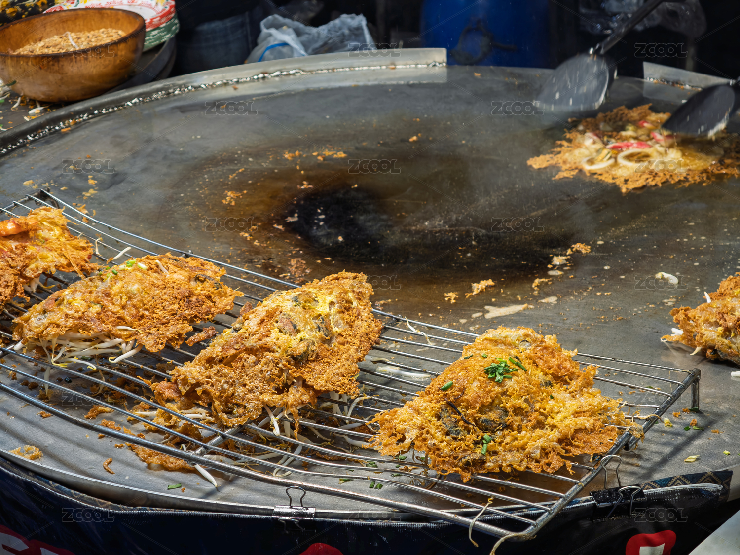 泰国街头美食摊上正在烹饪的酥脆泰式蚝烙