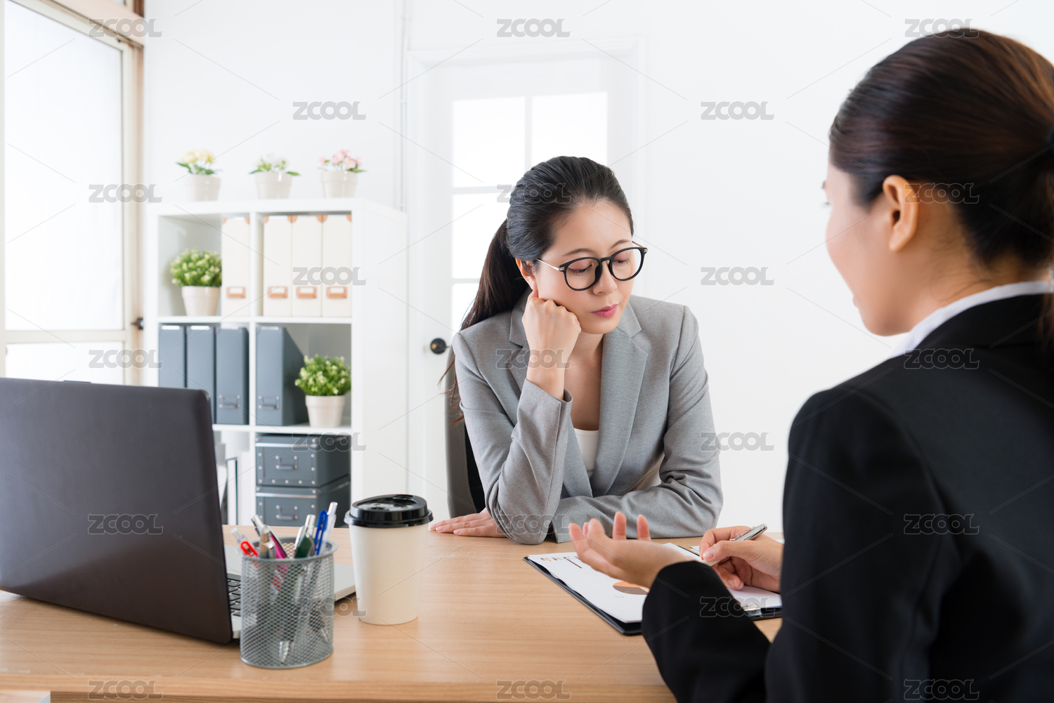漂亮优雅公司的女同事在办公室一起谈话,讨论如何做合作情况的交易合同。