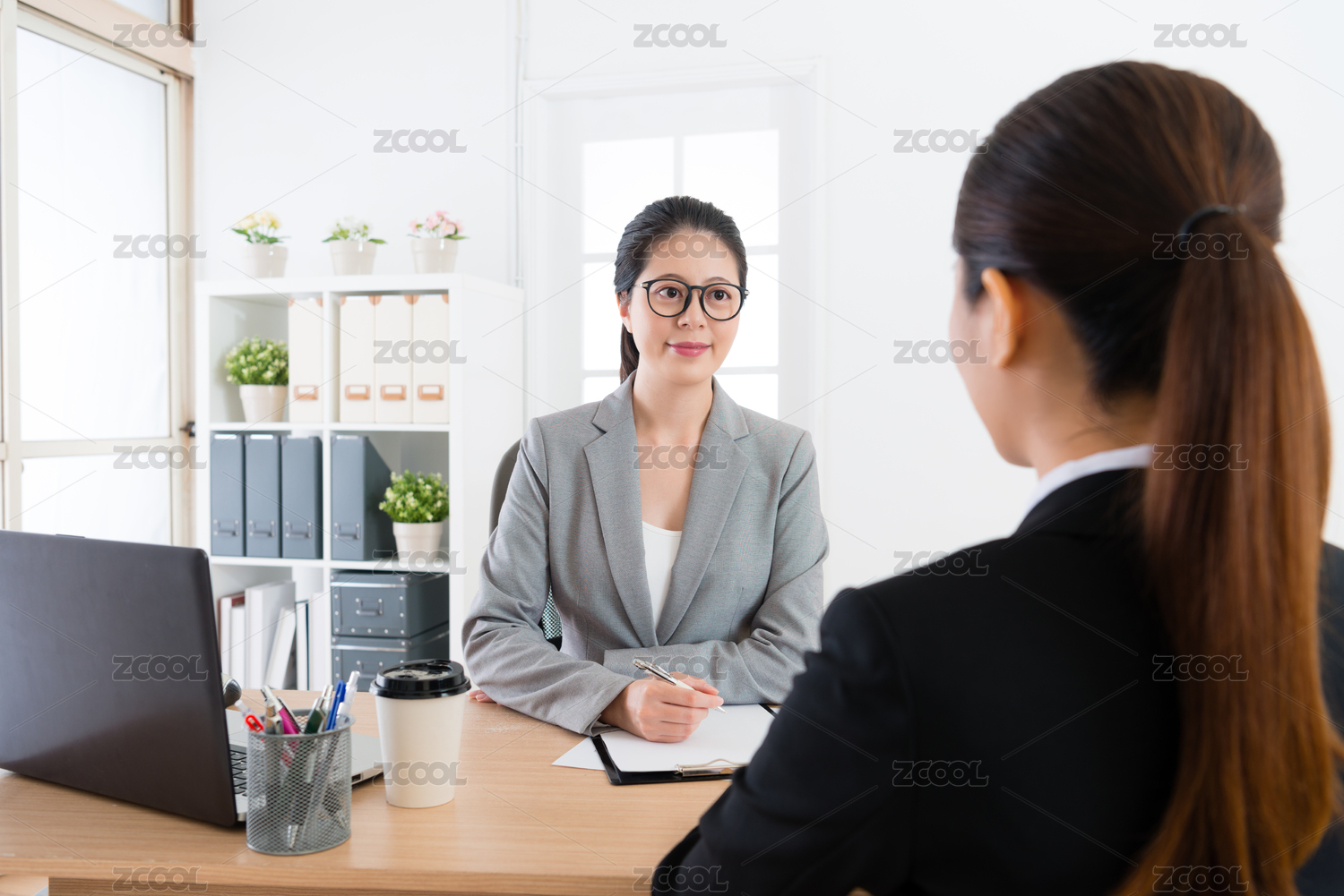 年轻漂亮的女孩参加公司面试找工作,并用微笑优雅的办公室经理女人说话的后视图。