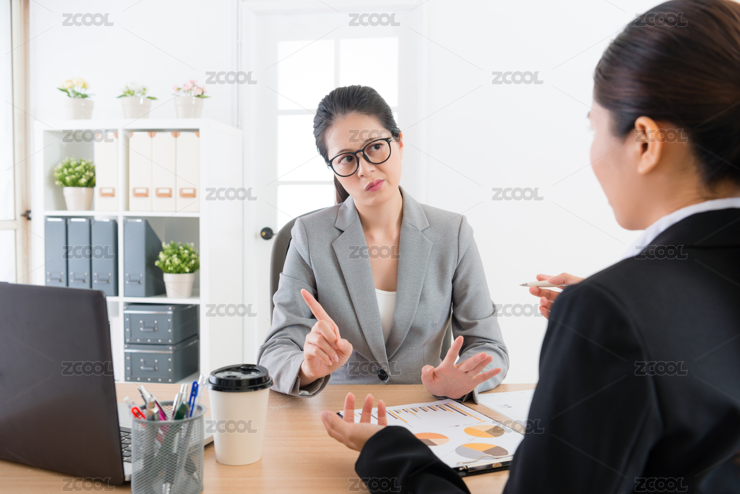 亚洲女老板混淆图项目,并要求员工指责的office lady workshit与她的手势和平均脸。她是不快乐的事心烦的问题。