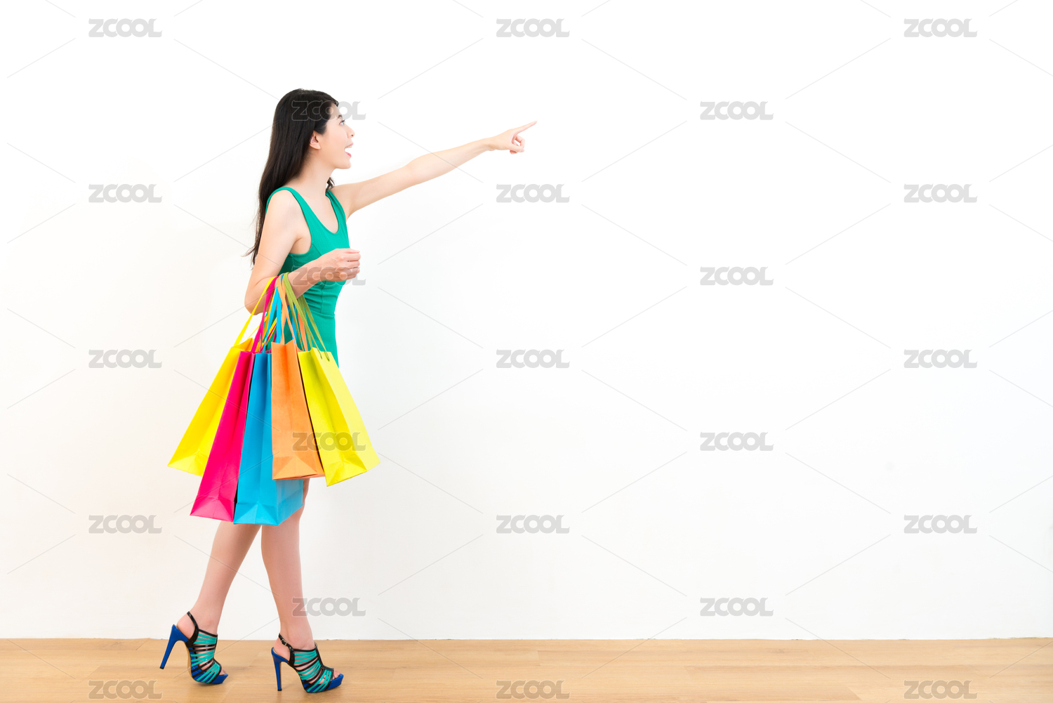 漂亮的微笑小姐穿着绿色的衣服背着五颜六色的购物袋站在木地板,使显示的姿态显示白色空白区域。