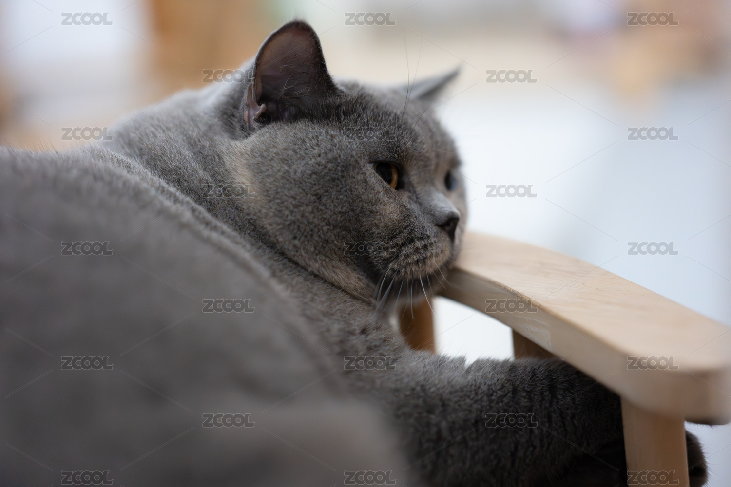 英国蓝猫腮帮托着沙发手柄睡觉,室内有阳光