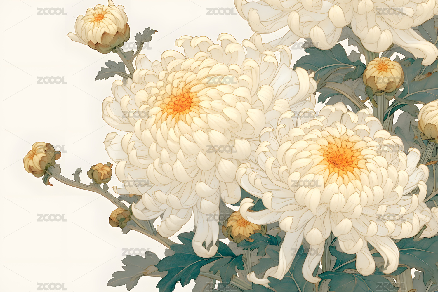 AIGCFG01,复古,日式,菊花,植物,插画,插图,白色,昆虫,国风