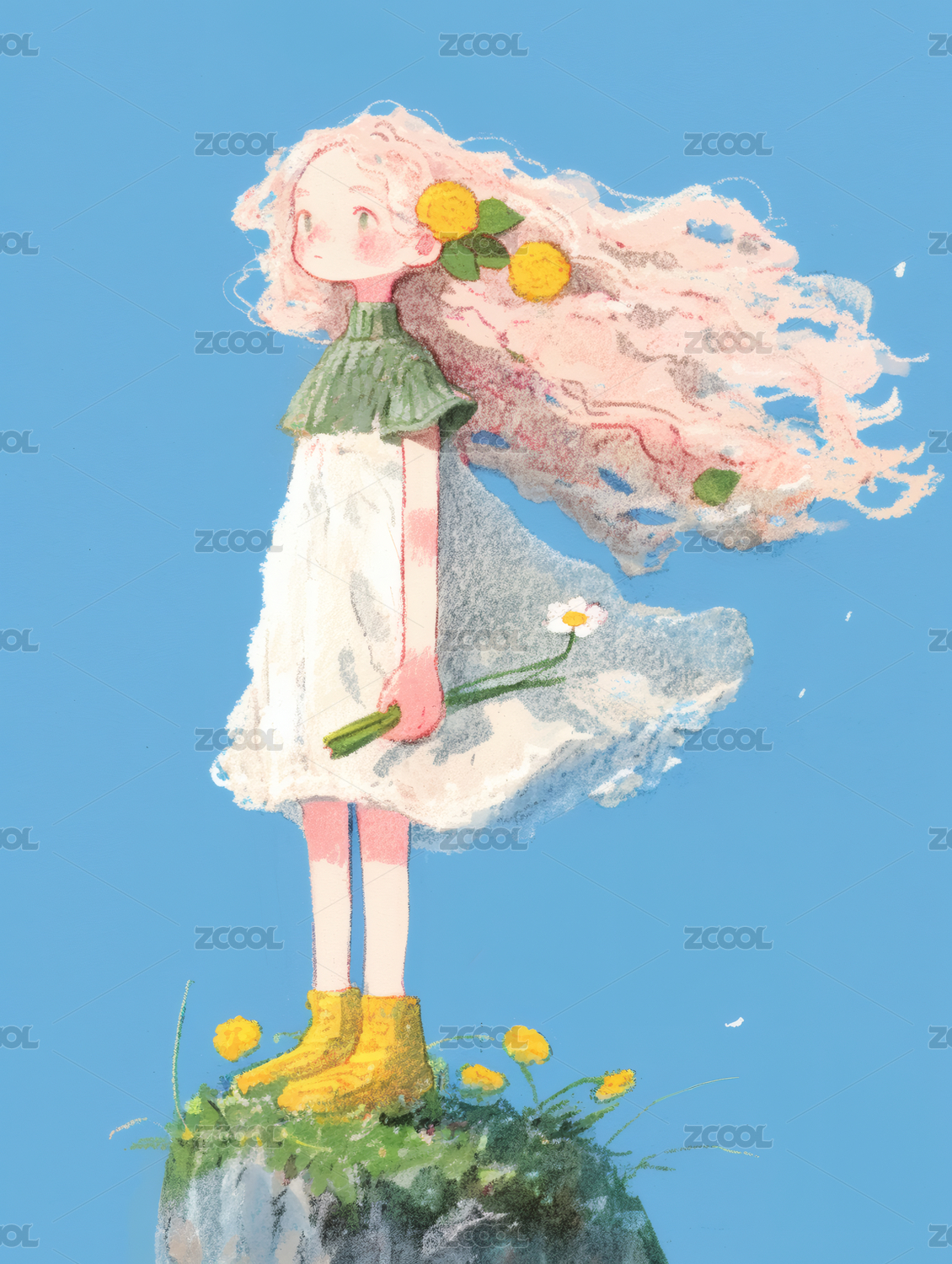 大波斯菊盛开的山坡和穿黄裙子的女孩