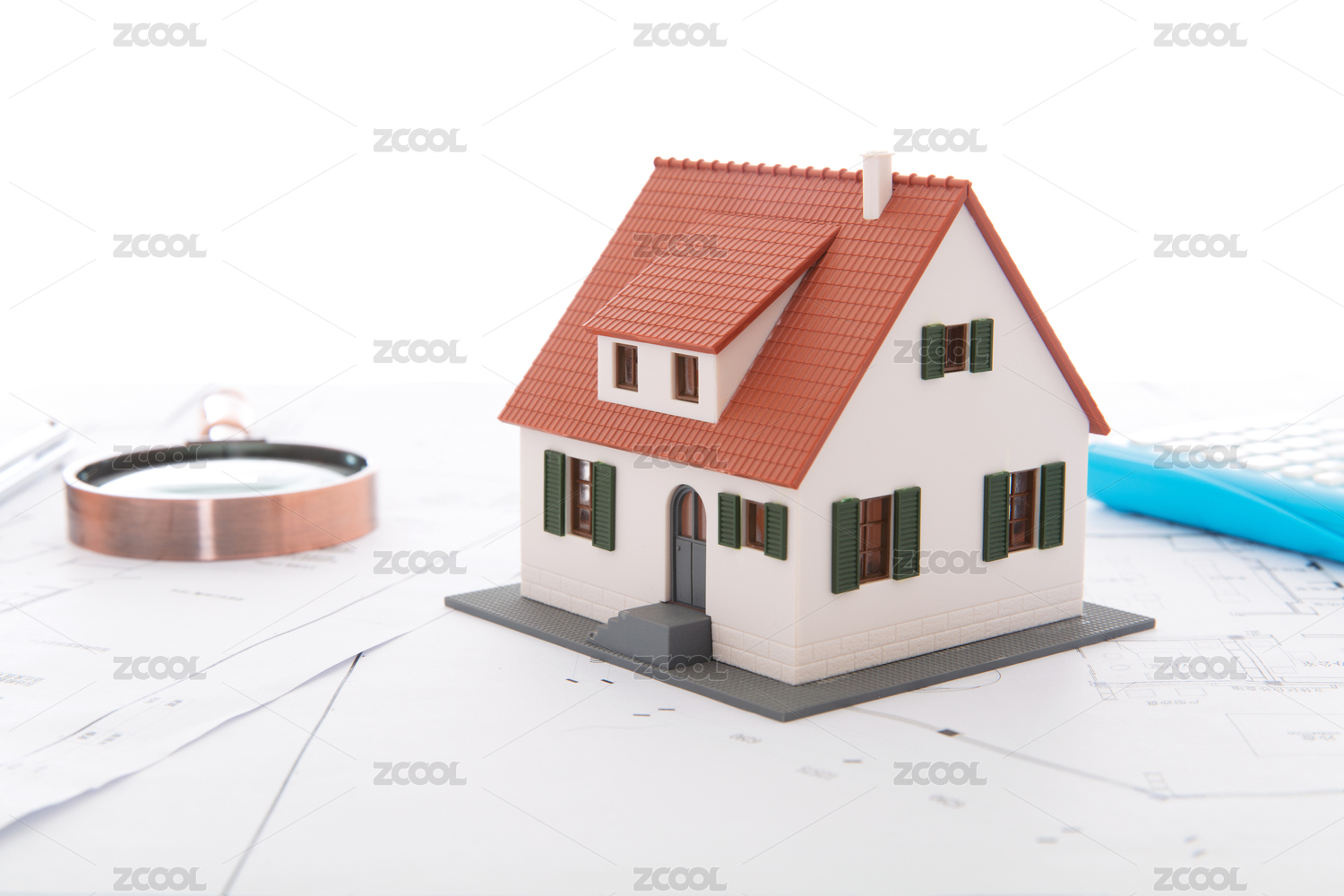 建筑图纸上的小房子模型和放大镜等相关工具