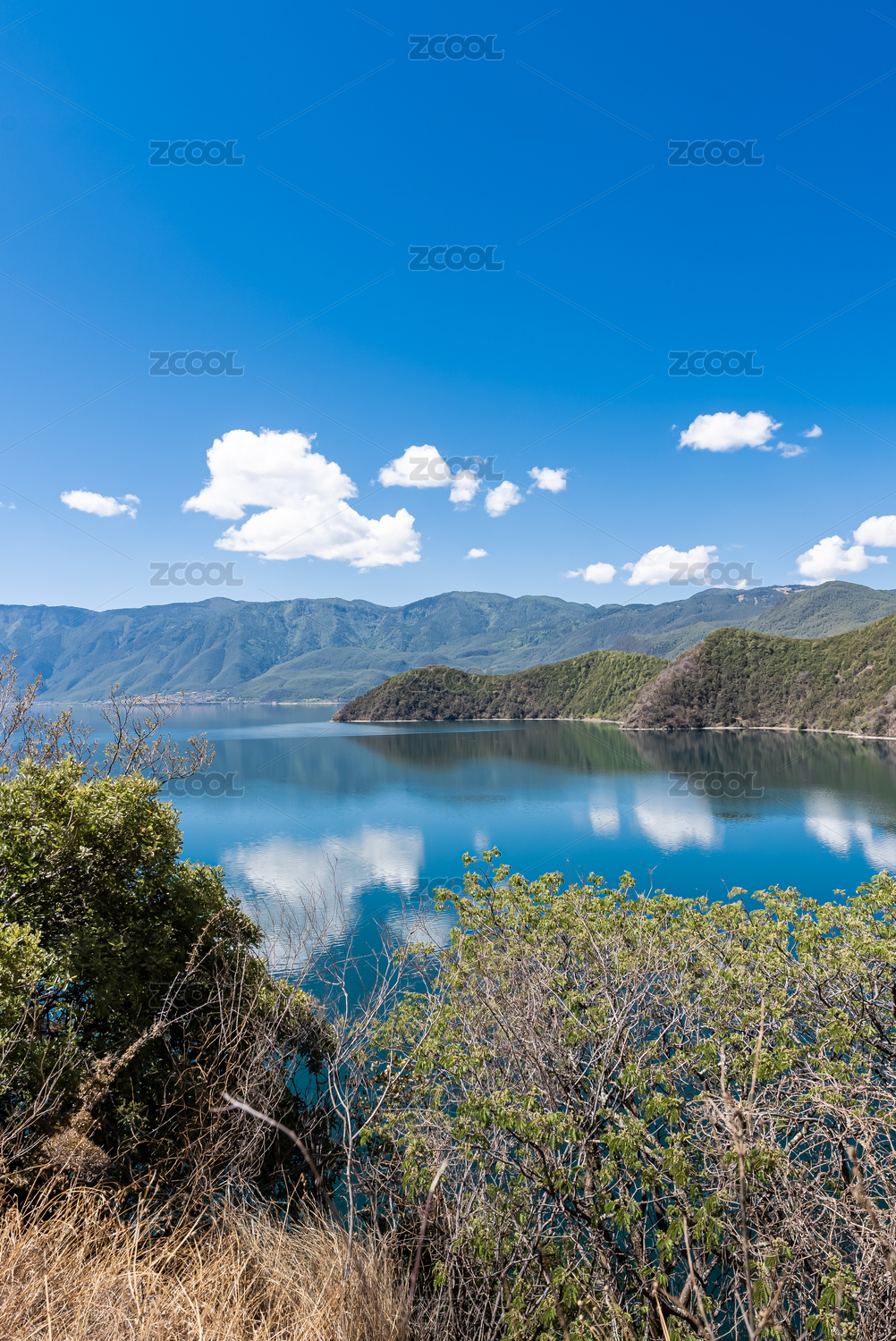 蓝天白云倒影在中国泸沽湖的水面上