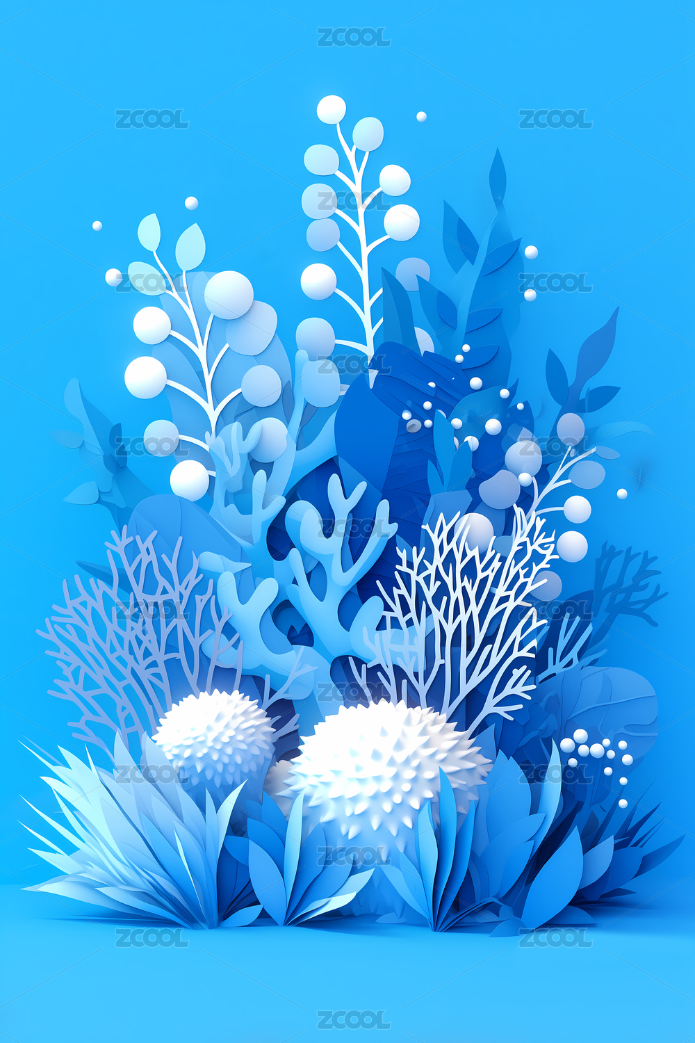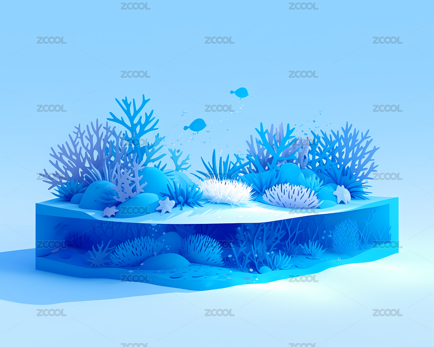 三维,插画,3D,生态,环境保护,剪纸风格,蓝色,海洋,珊瑚,自然美