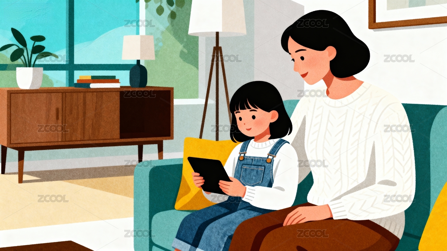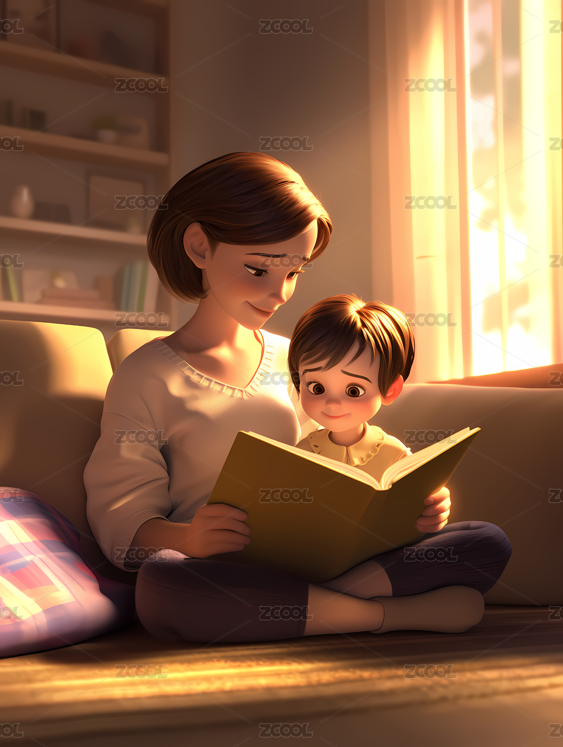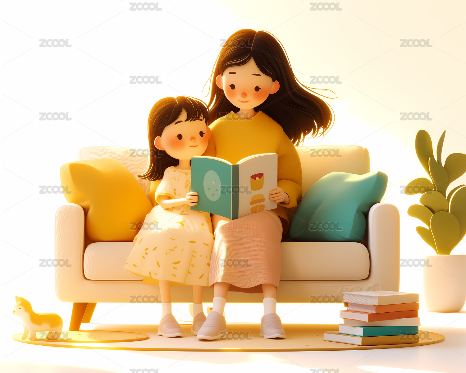 客厅里妈妈坐在沙发上陪女儿读书3D插画