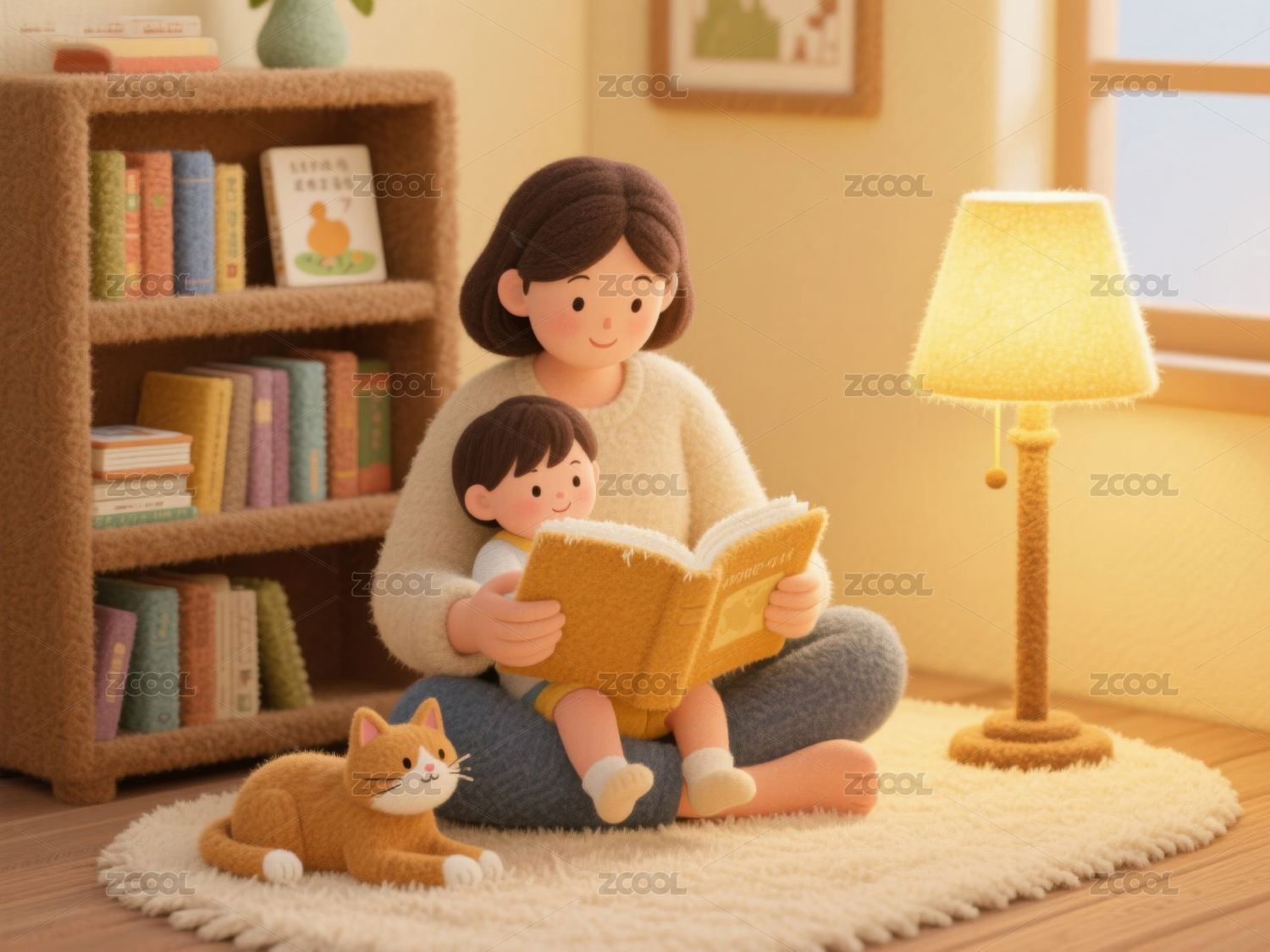 世界读书日妈妈陪孩子看书C4D卡通人物