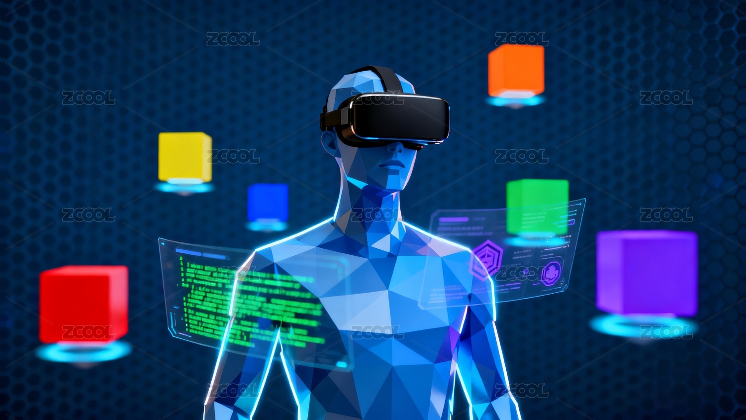 戴着vr眼镜的女性幻想彩色方块潮流插画
