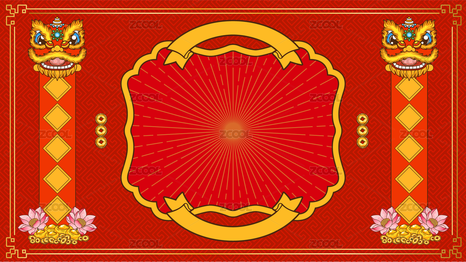 中国传统矢量红色龙年醒狮对联方形装饰背景