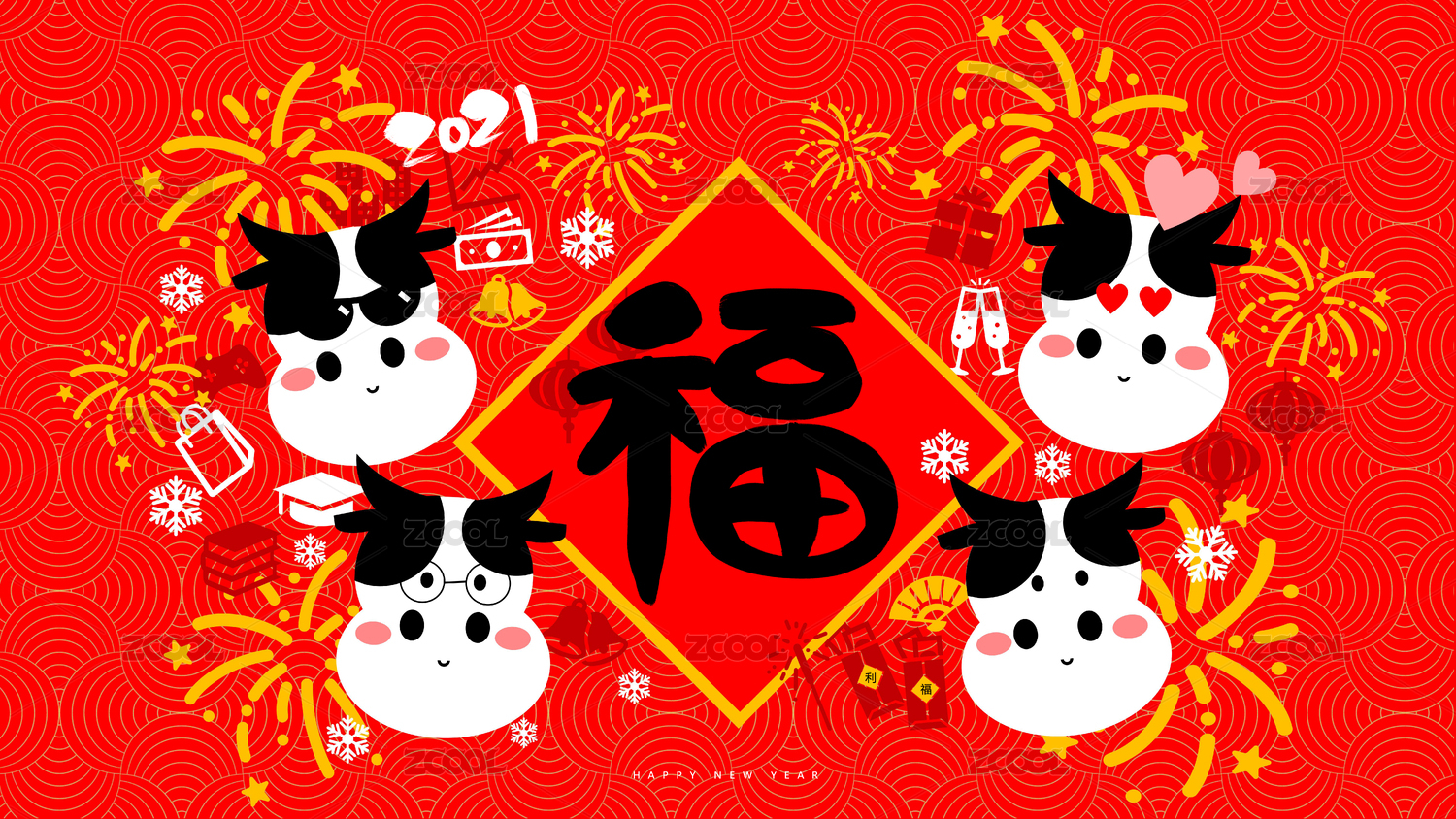 新年2021年牛年春节,牛在舞狮庆祝节日