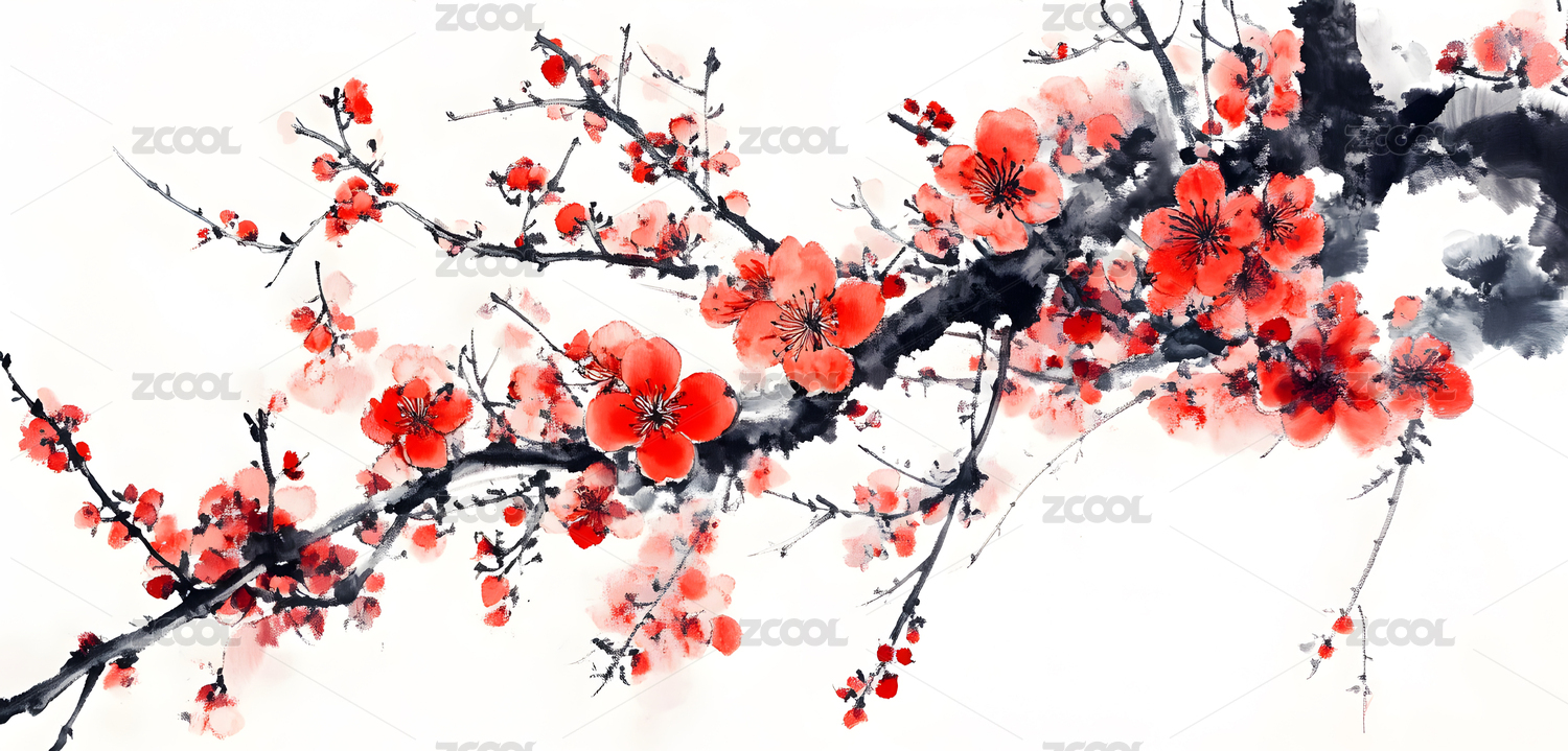 盛开的桃花花枝,水墨风手绘水彩插画素材
