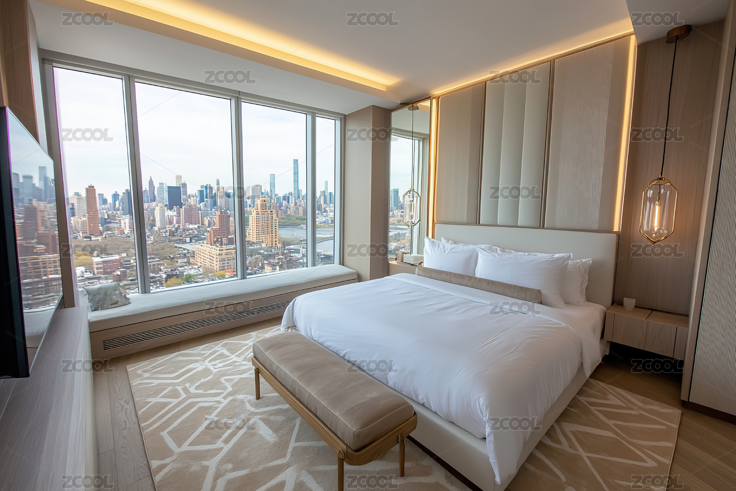 现代豪华酒店客房的大窗俯瞰城市景观