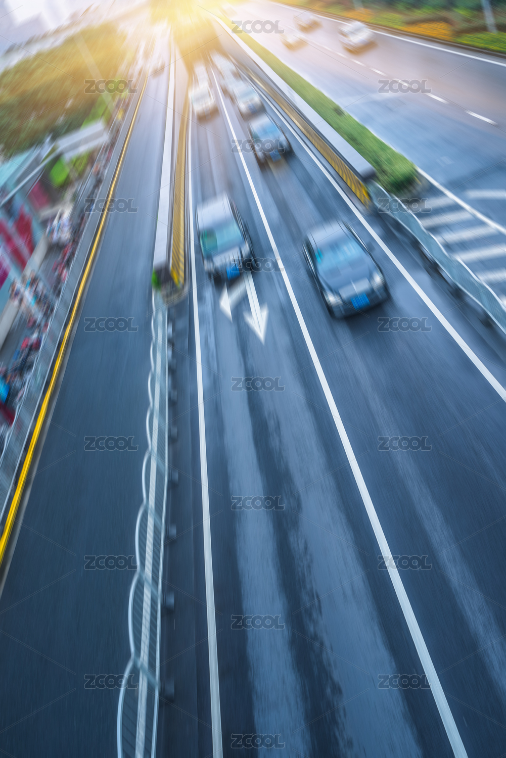 车行驶在高速公路上,运动模糊,蓝色色调的图像上。