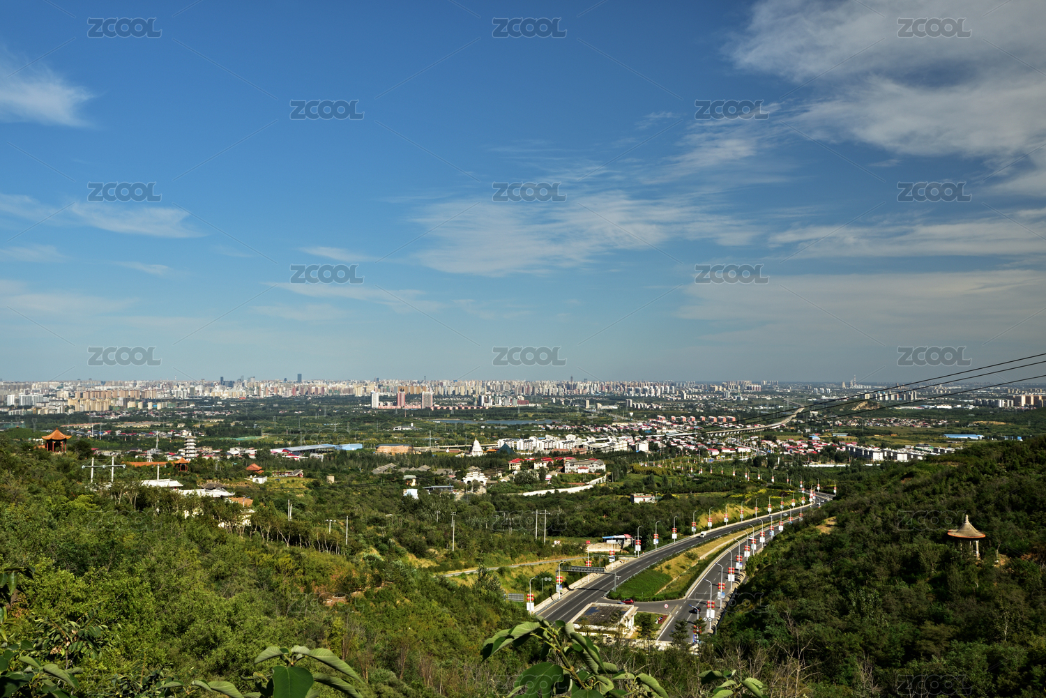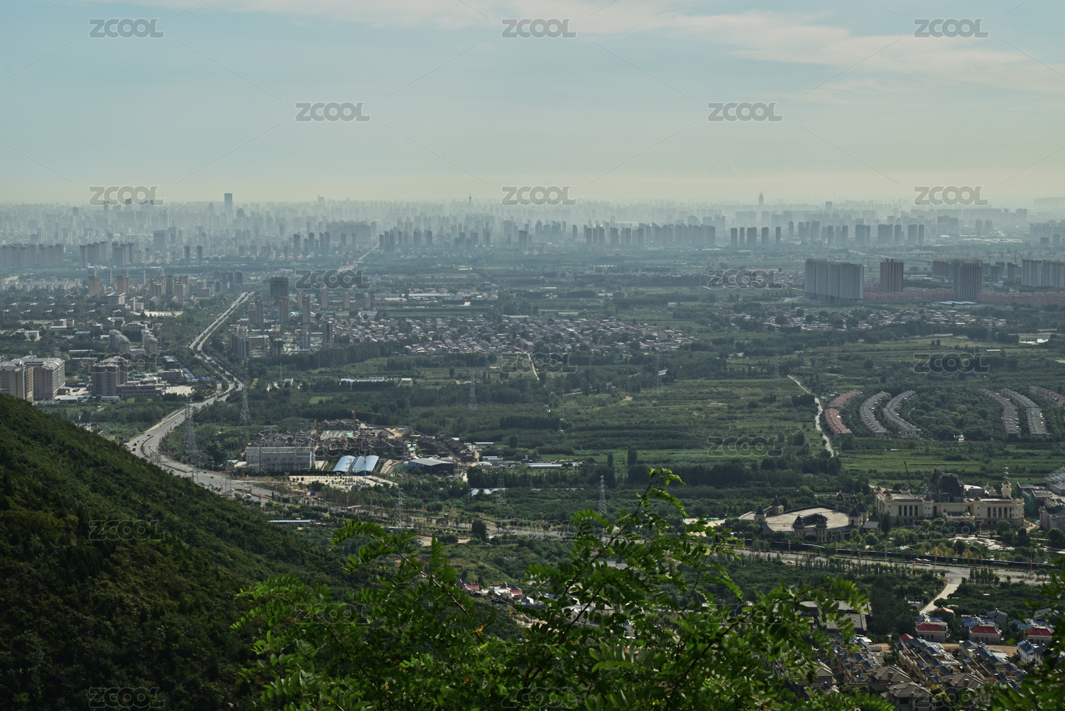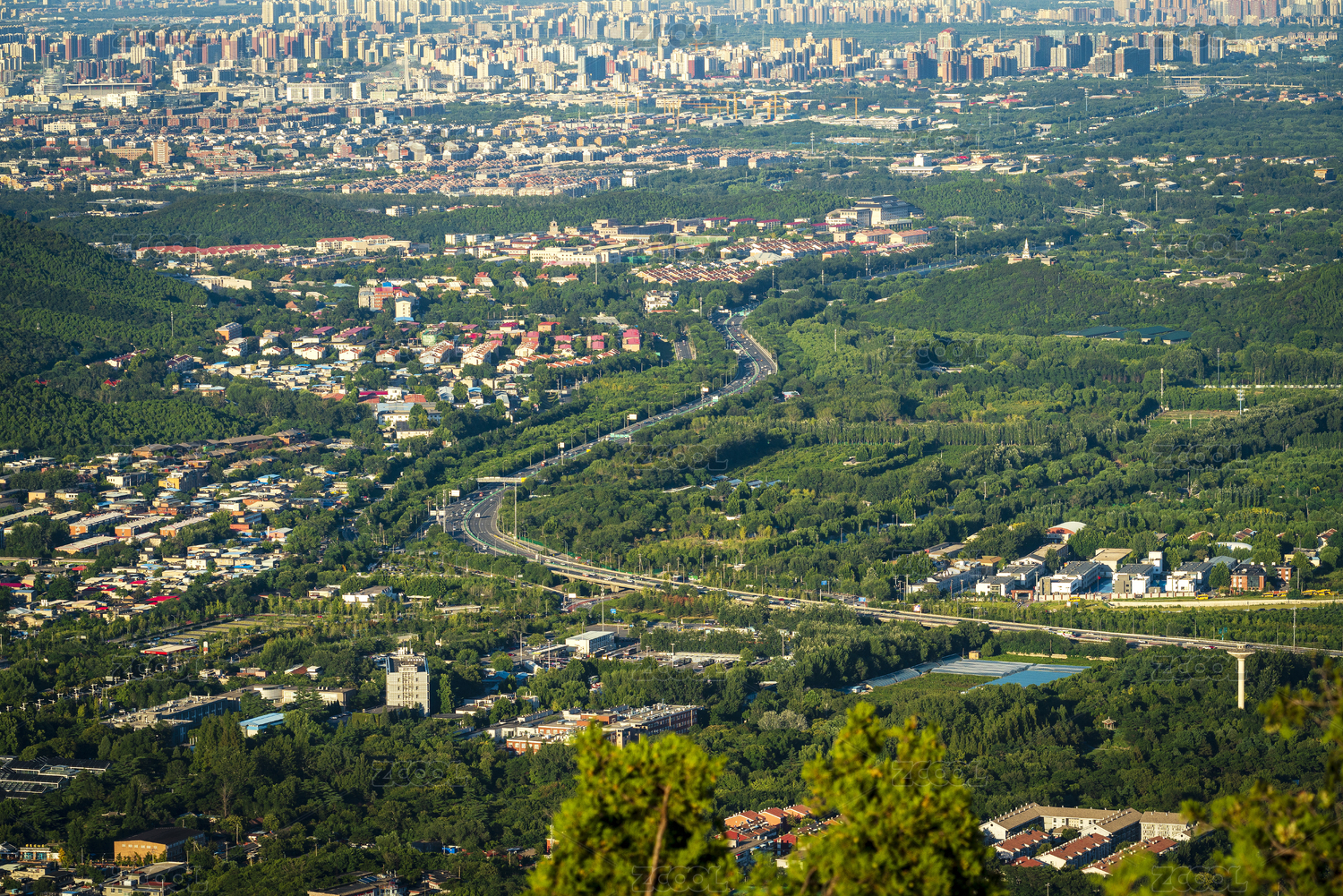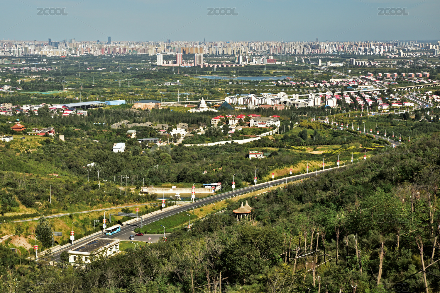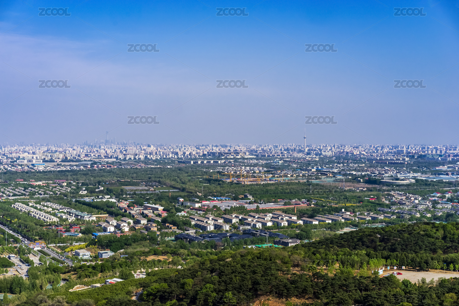 春天北京八大处公园视角长焦俯瞰城区及寺庙