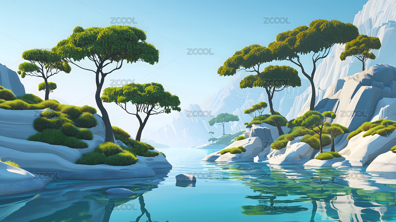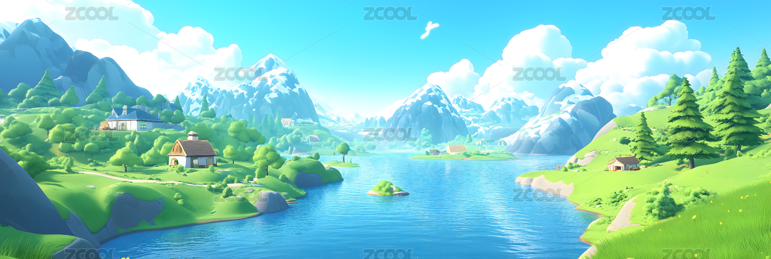 3D山地湖泊插画