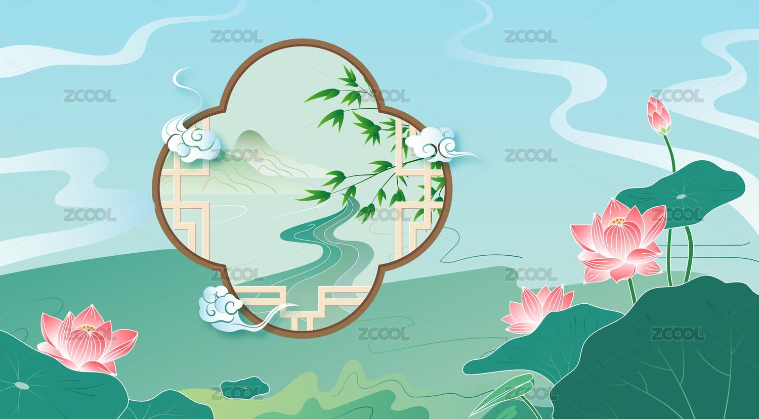 湖水荷花国风风景矢量插画