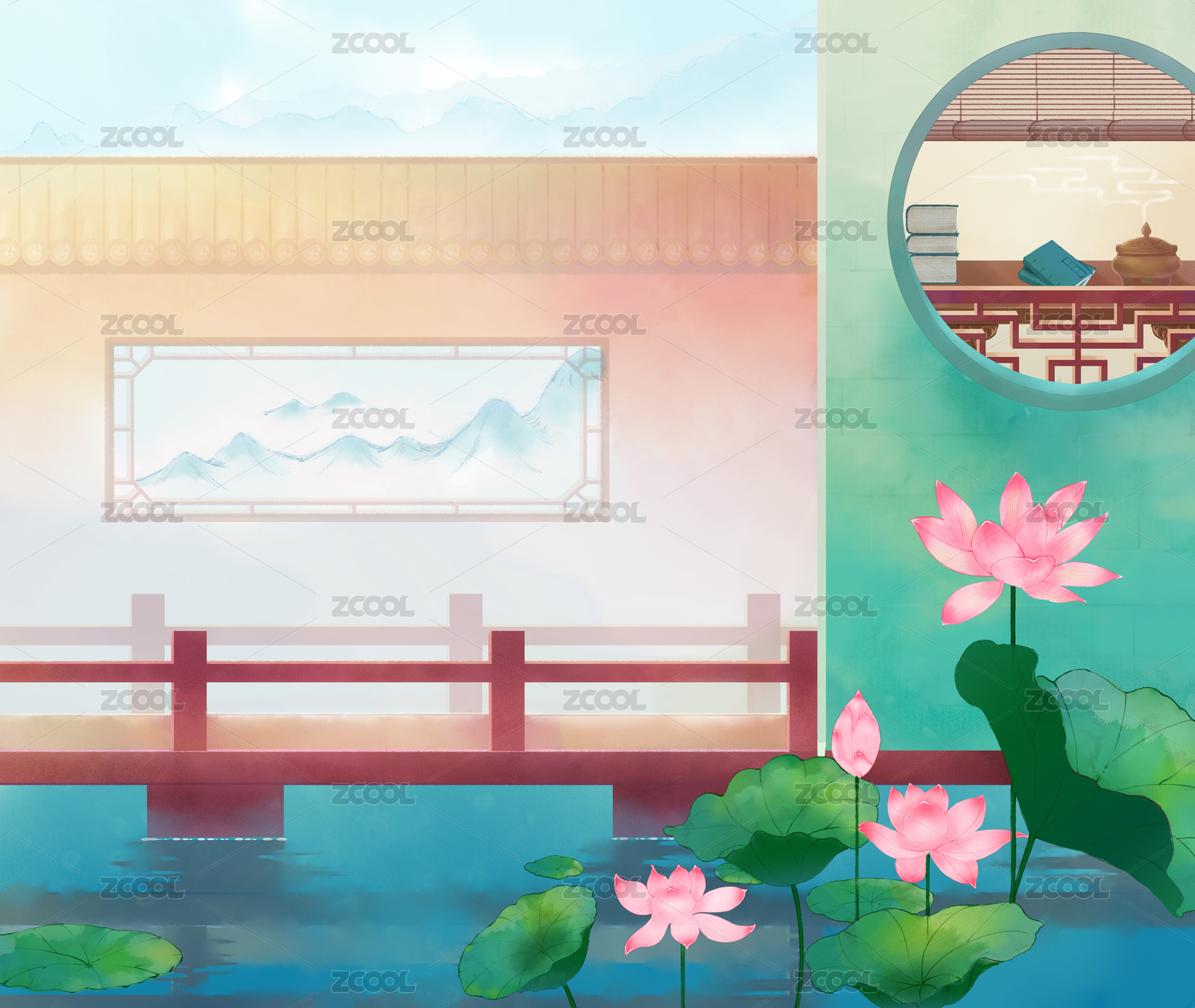 古风插画圆窗景
