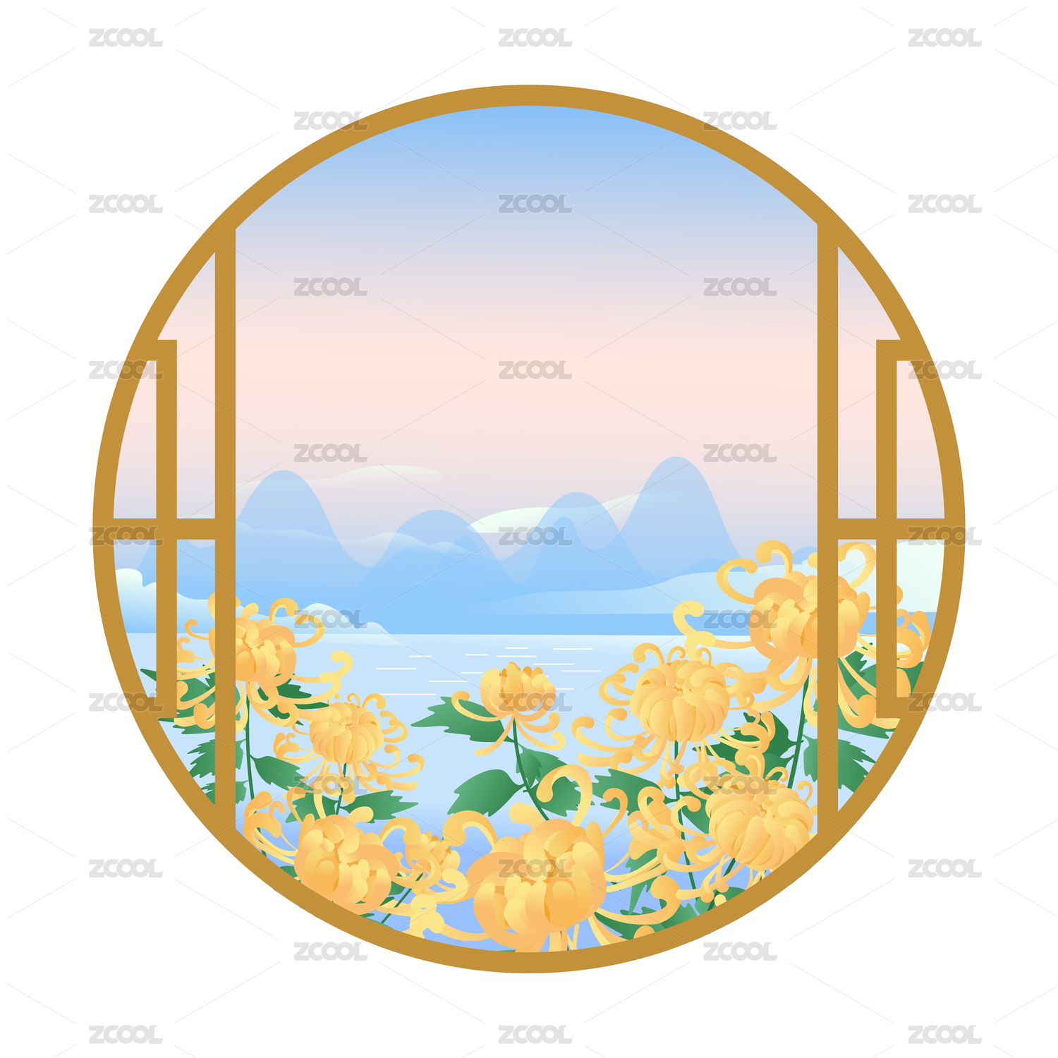 菊花古窗山水风景矢量插画