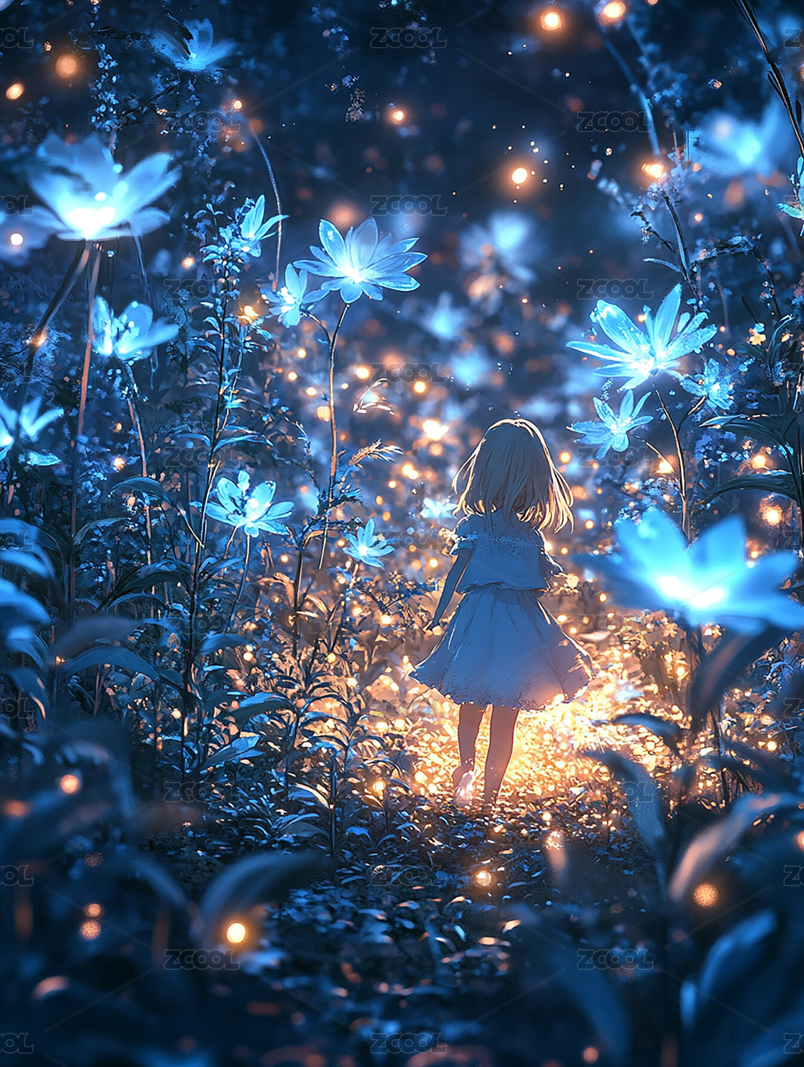 女孩萤火森林月光夜