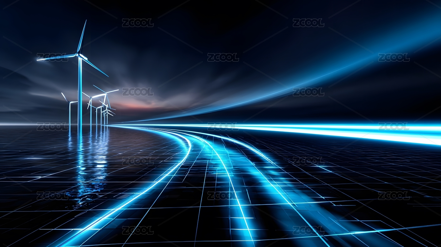 蓝色光轨与风力发电机夜景