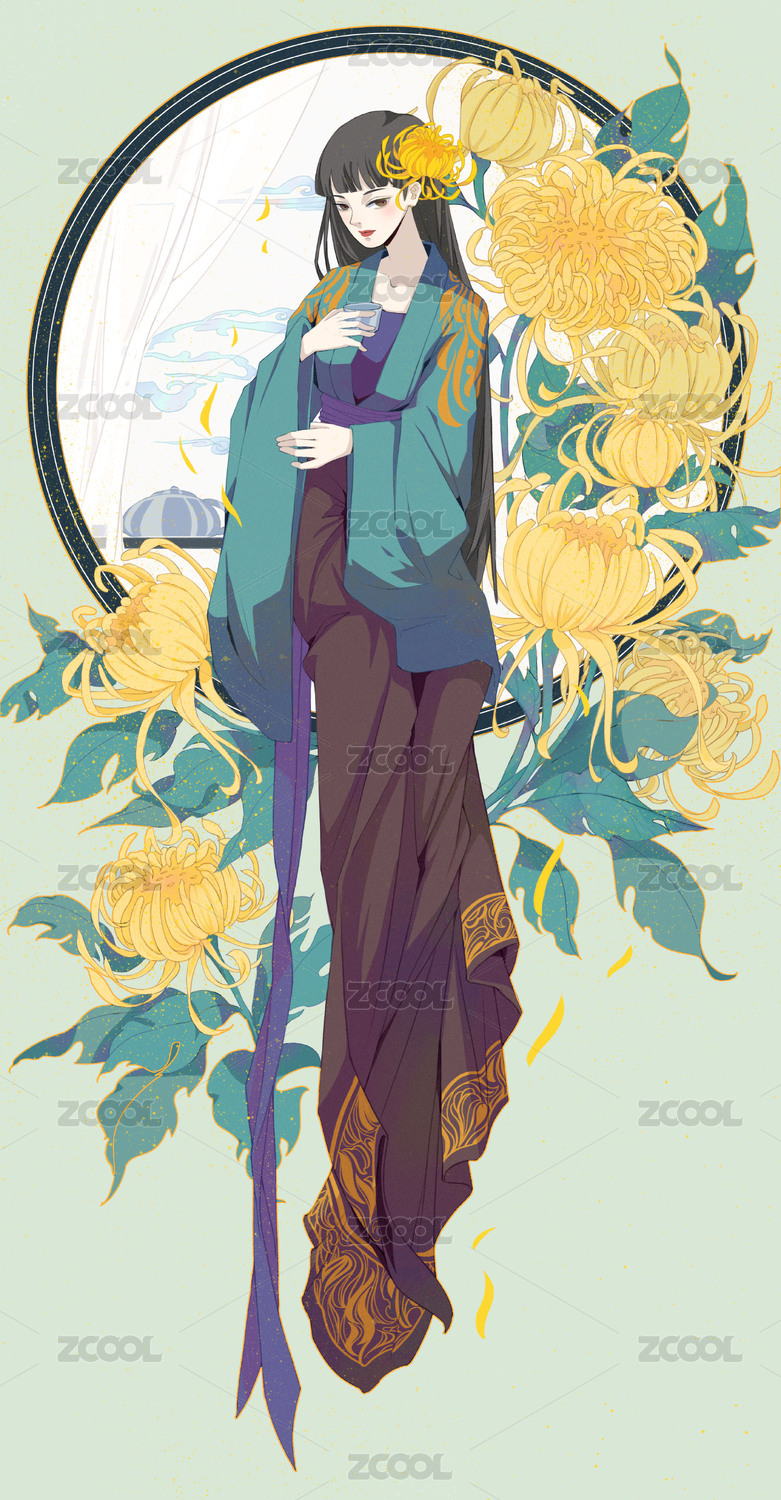 中国风古风汉服细线人物花卉插画-菊花品茶