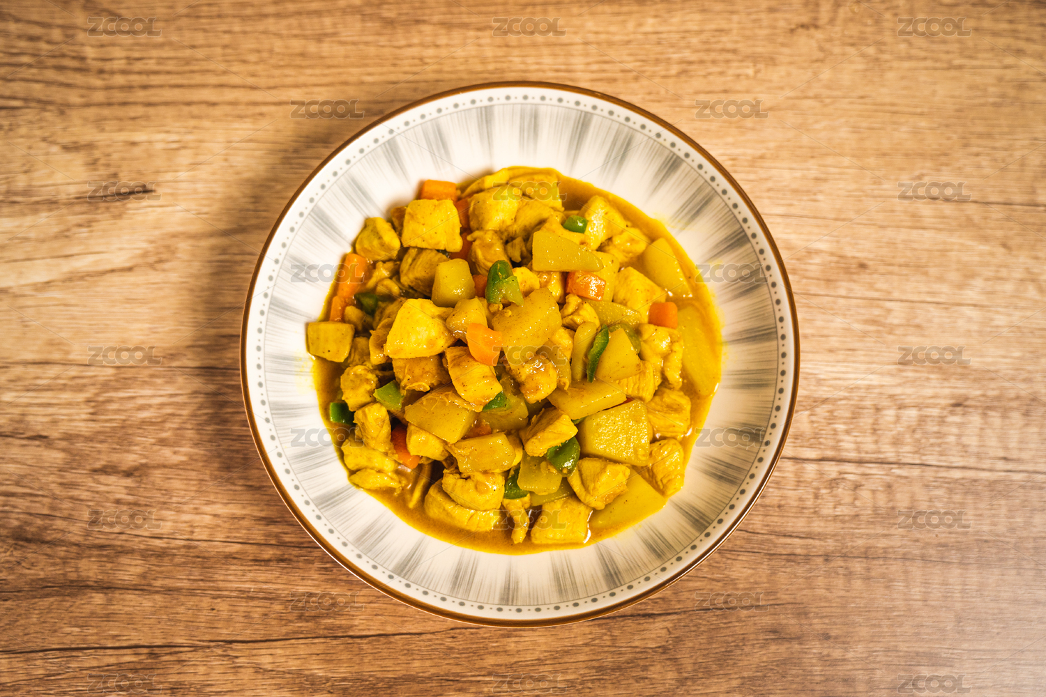暗色木纹桌面上放着一盘咖喱鸡块