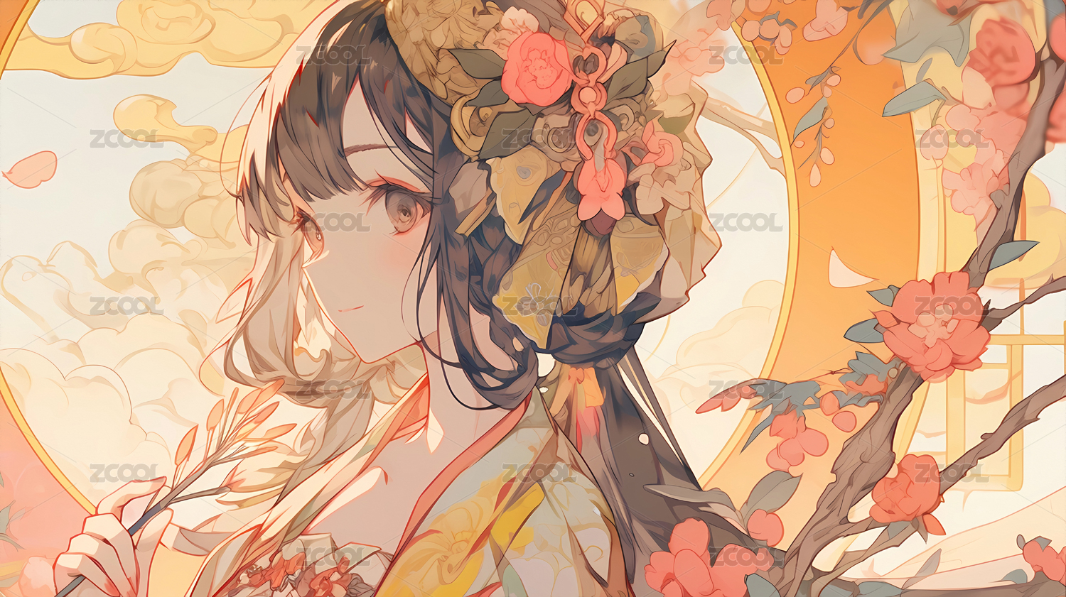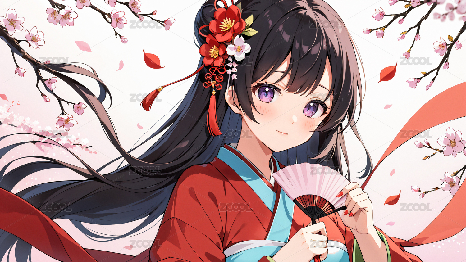 手绘卡通古风身穿传统服饰汉服漂亮女孩插画