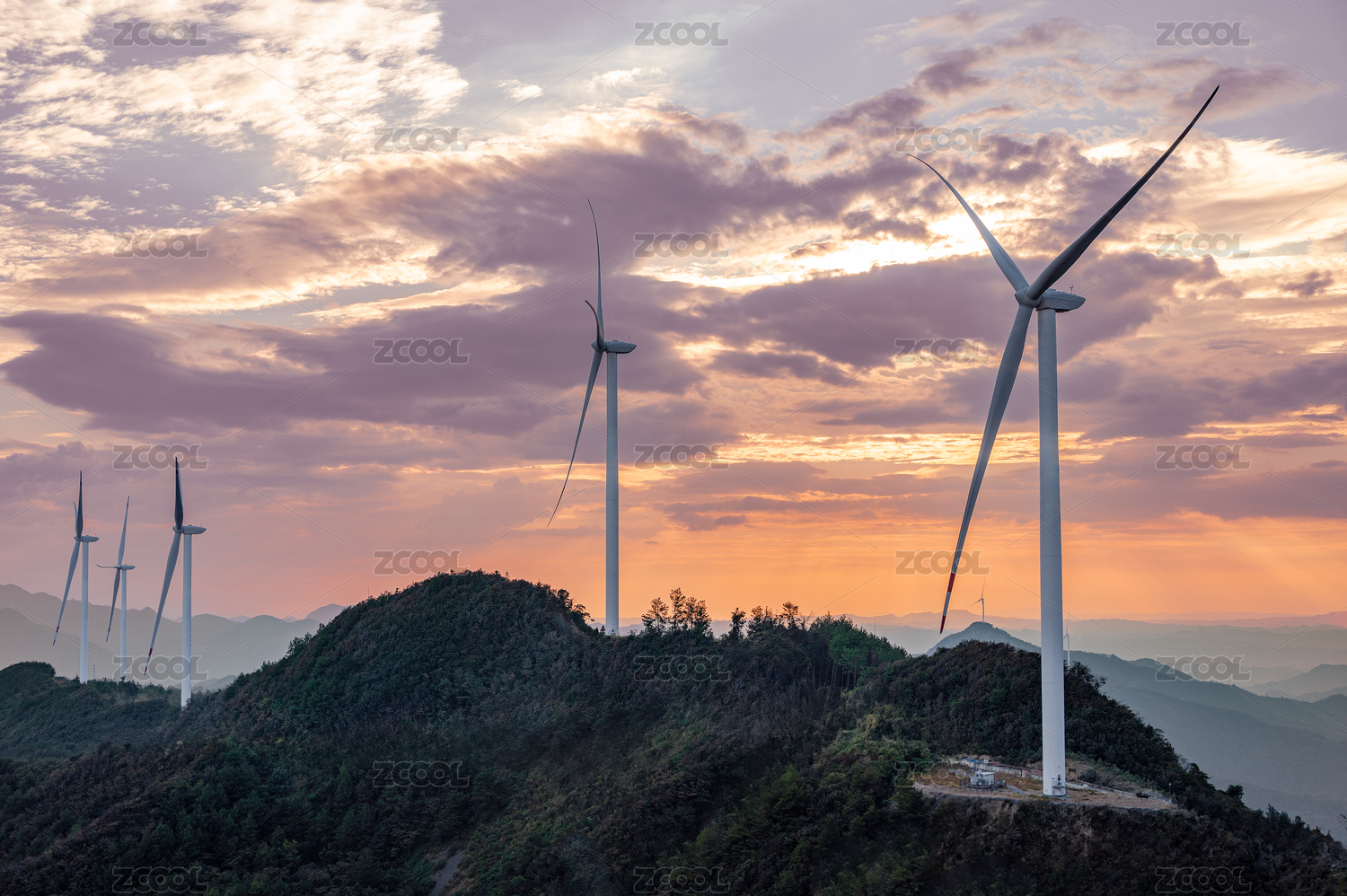 夕阳下群山之间的风力发电风车