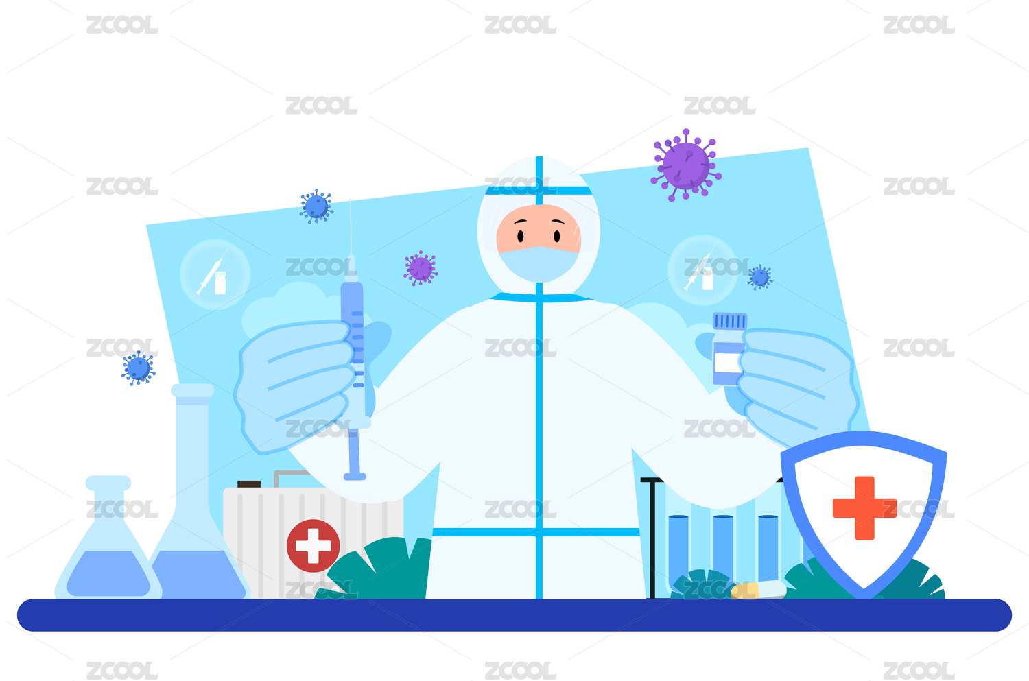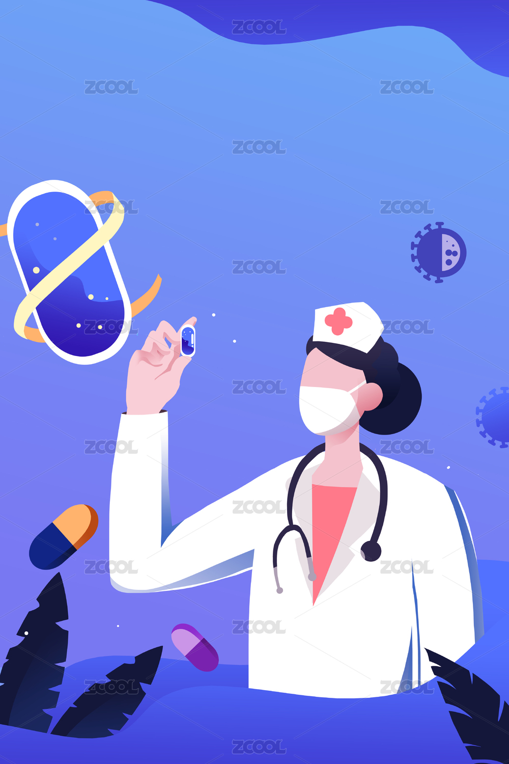 卡通手绘戴口罩女医生手拿病毒疫苗样本插画