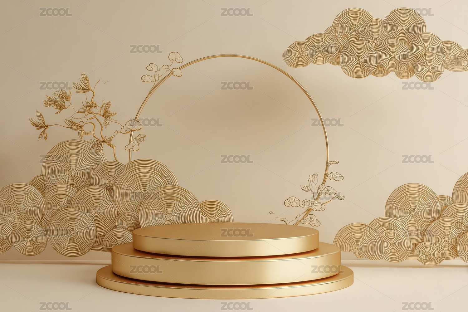 金色云纹装饰的圆形舞台展示场景