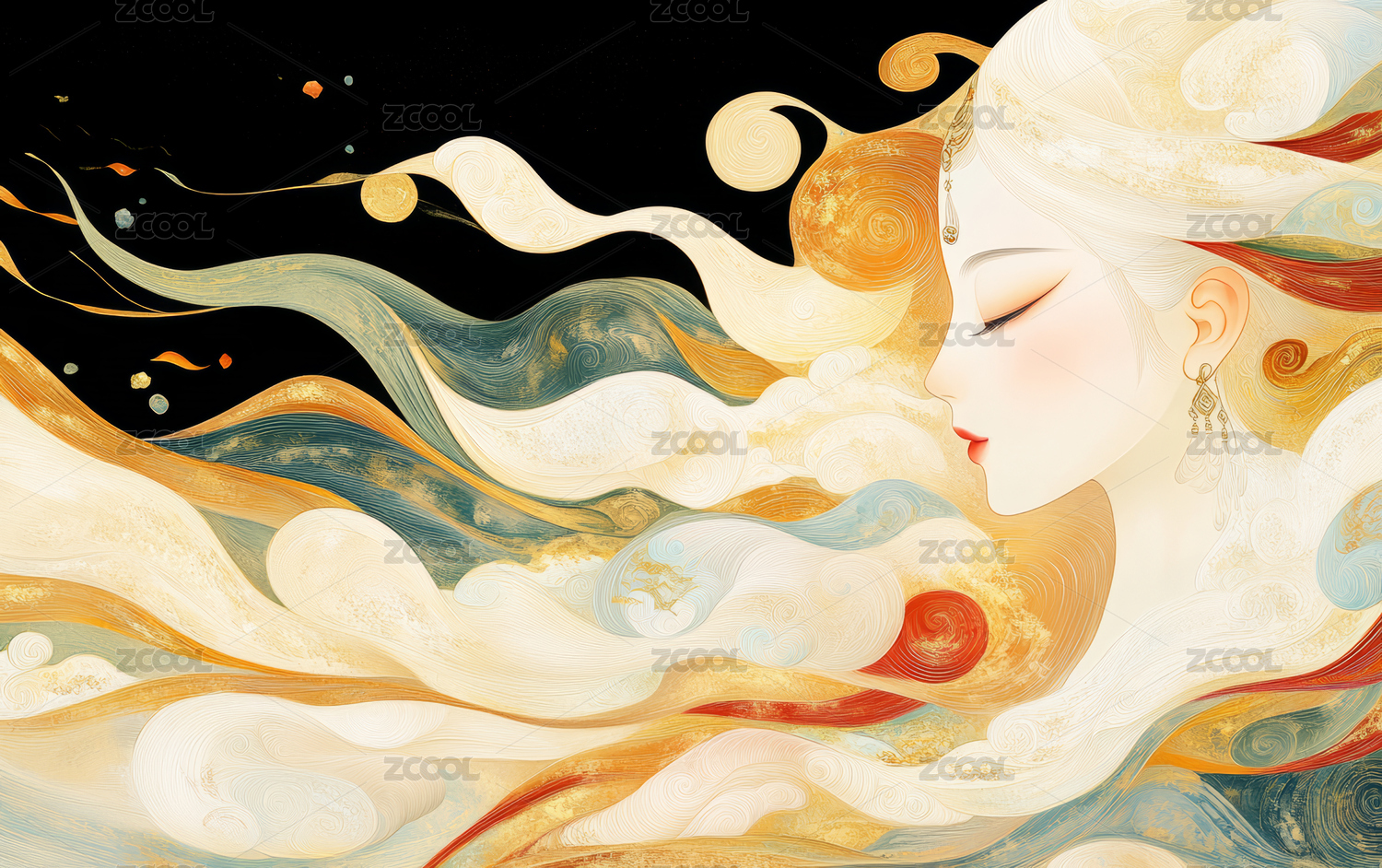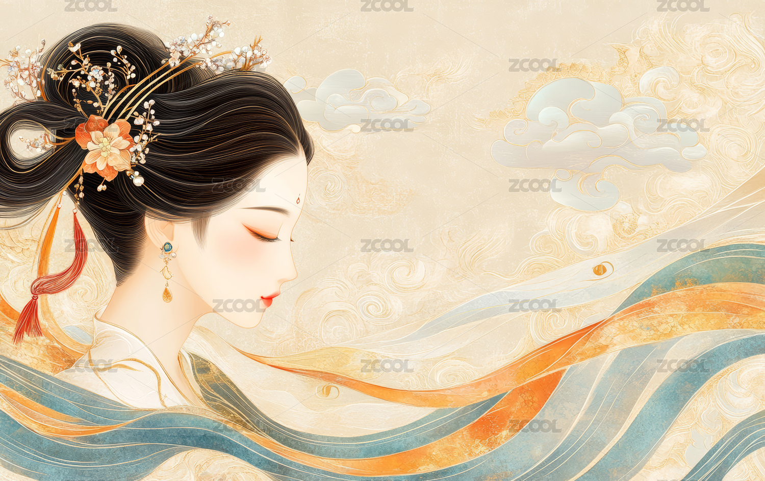 古代仕女飘带随风舞动的写意图