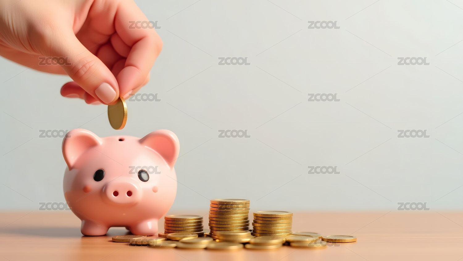 投资理财计划场景中的小猪存钱罐和一只手拿着美元硬币摆放