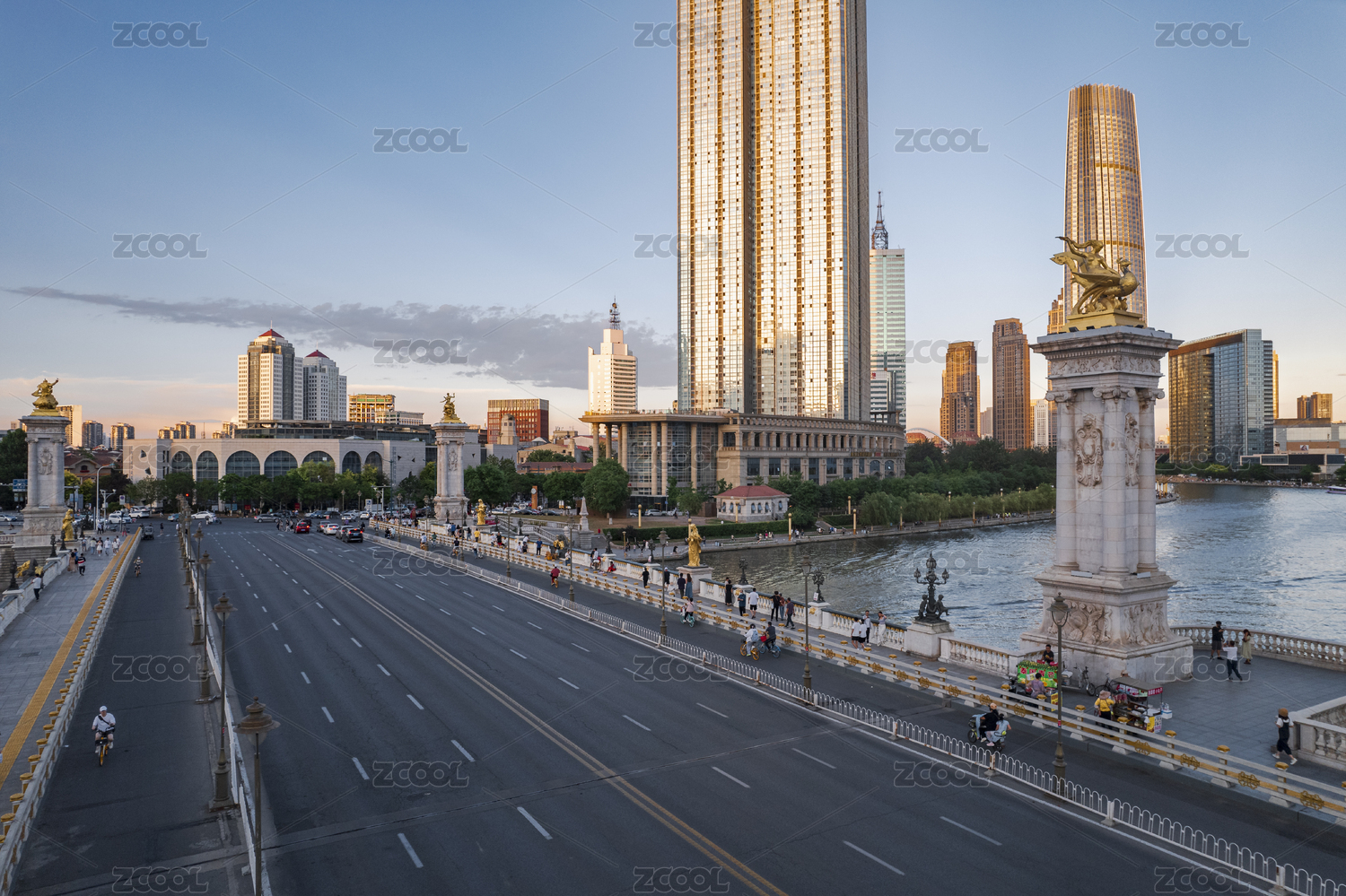 晴天多云天津海河大光明桥城市雕像建筑风景