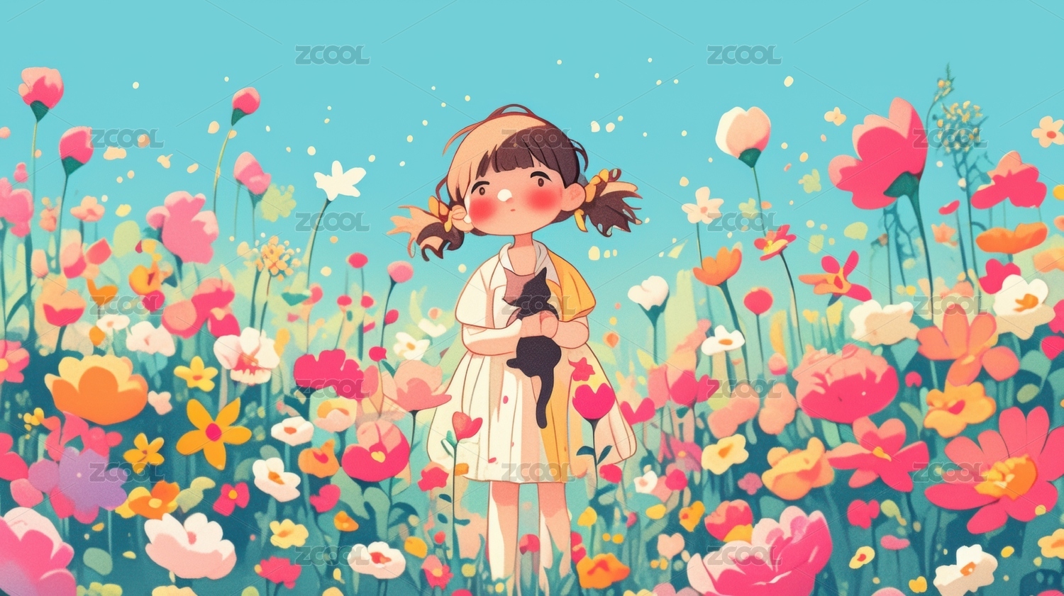 女孩,花,花朵,花丛,黄色,壁纸,唯美,红色,短发