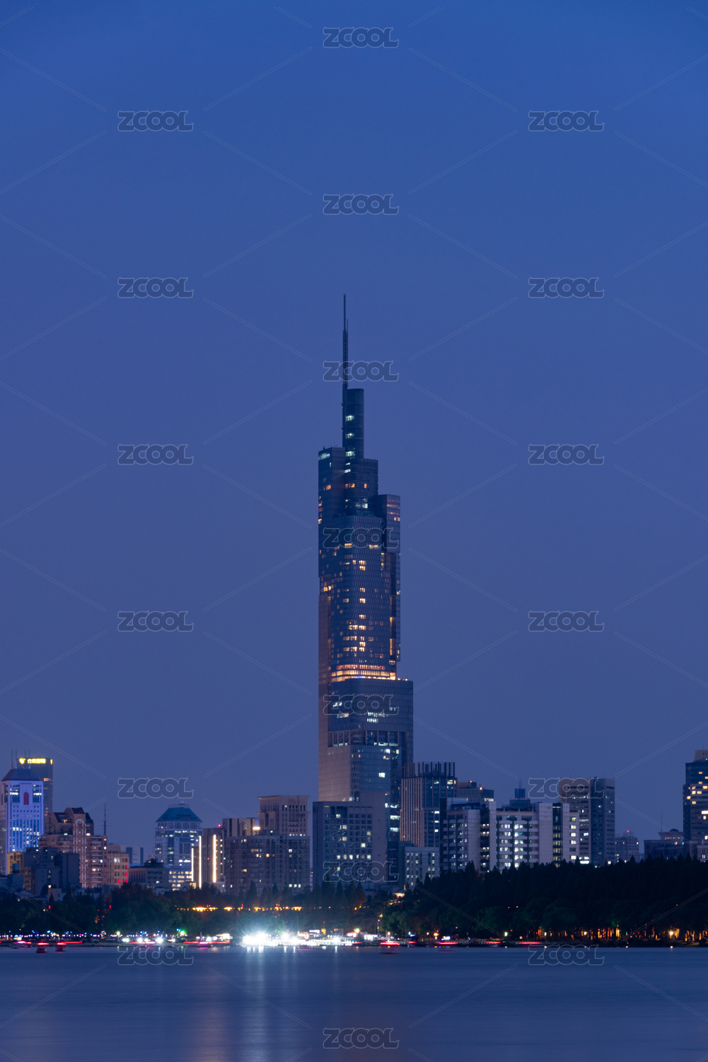 南京玄武湖畔的紫峰大厦建筑群夜景和倒影