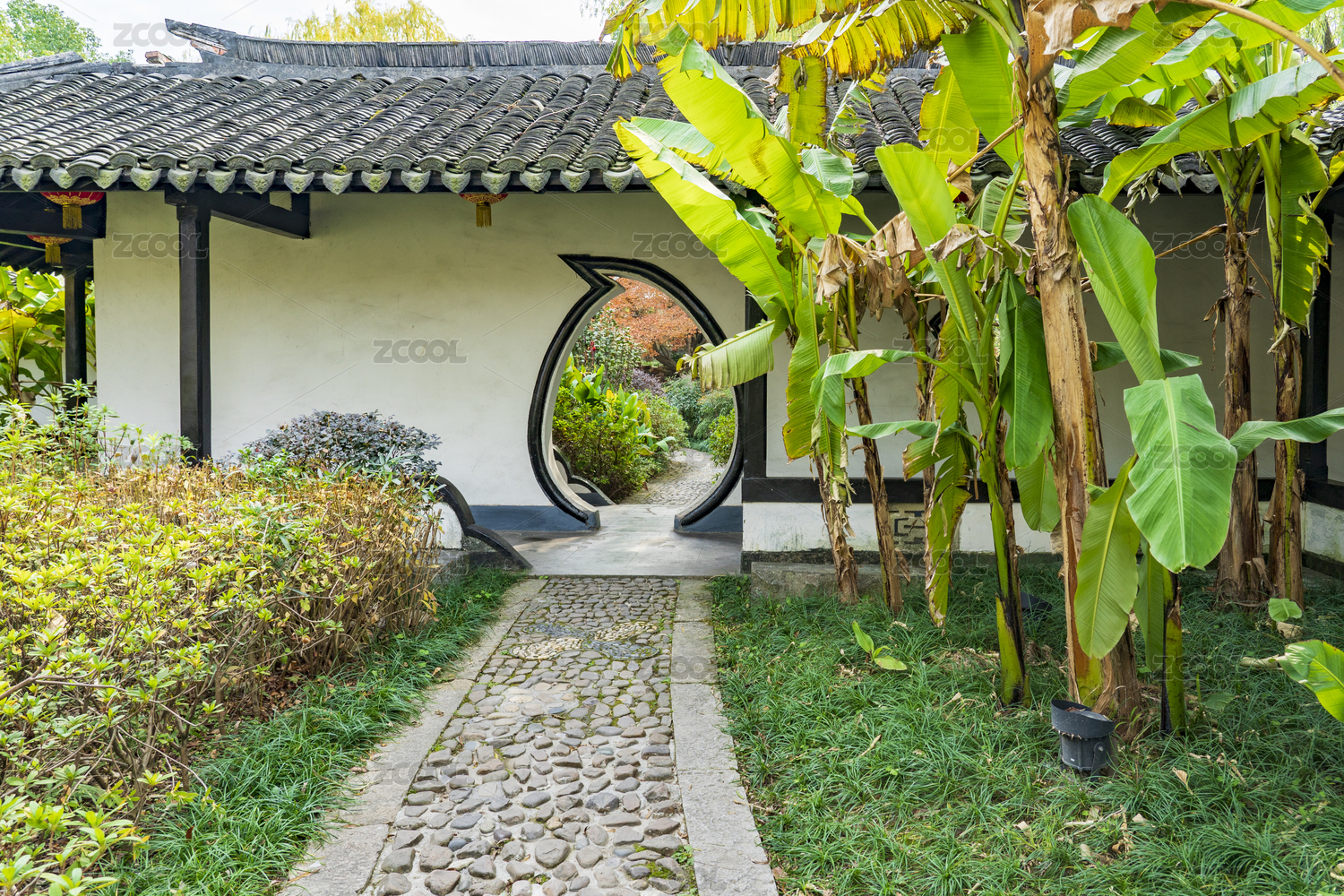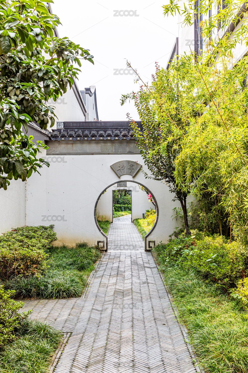 翠竹掩盖下的中式拱形圆门建筑