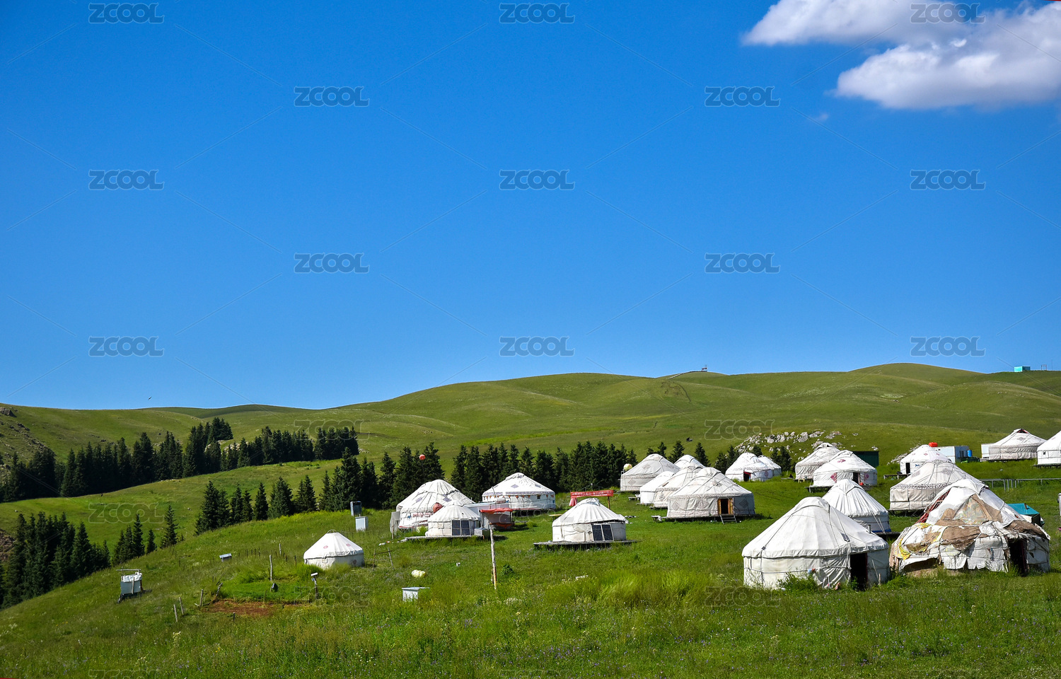 中国新疆伊犁喀拉峻草原露营帐篷自然风光
