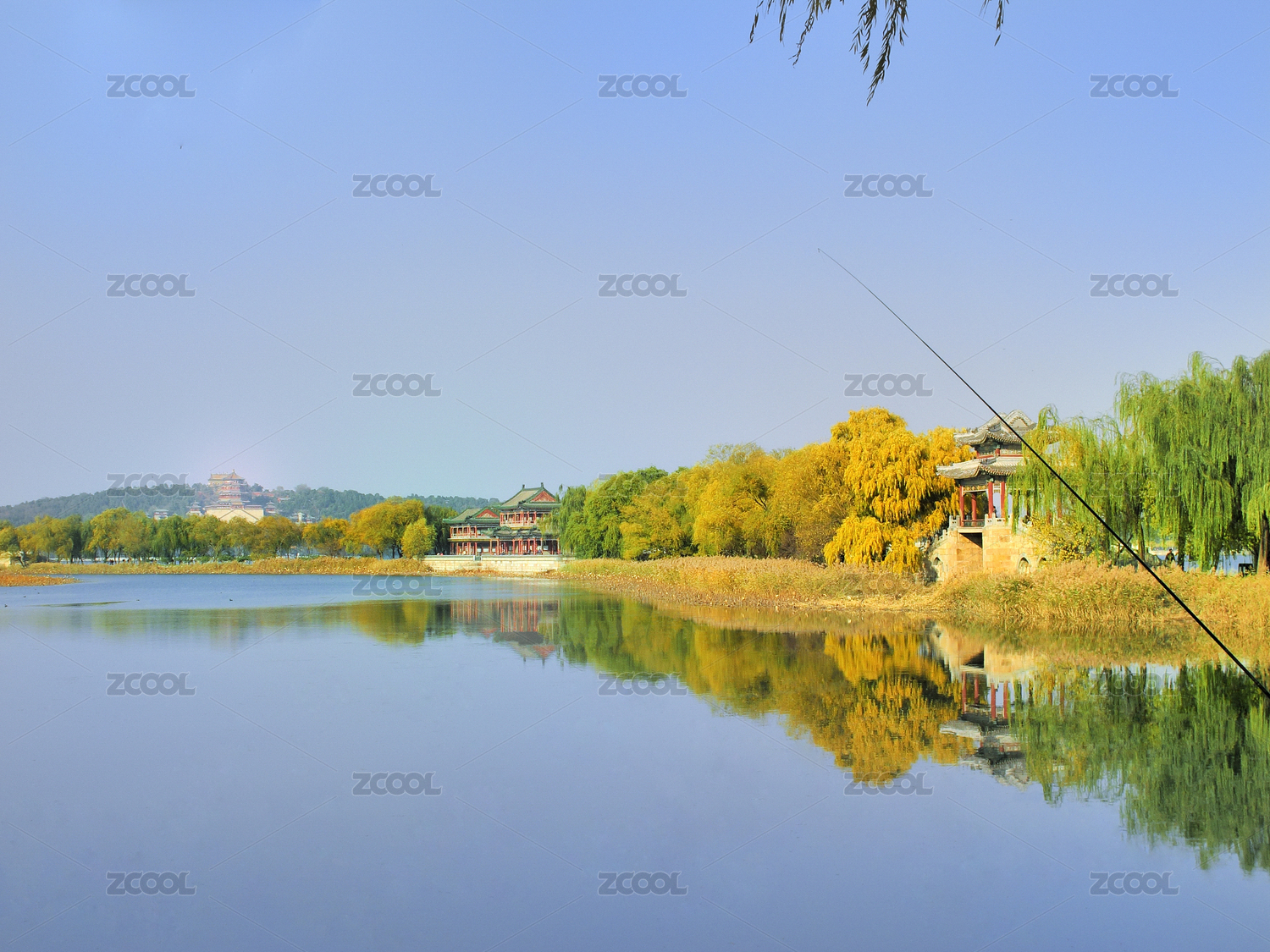 清晨阳光下的颐和园凤凰墩与远处的佛香阁